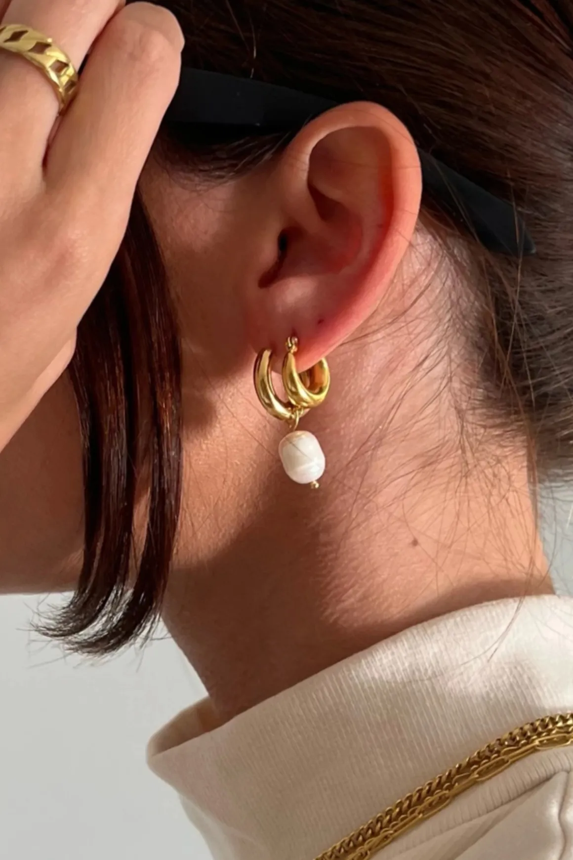 Melrose hoop earrings are water-resistant, made from gold-plated stainless steel, and feature freshwater pearls. Offers a snap closure.