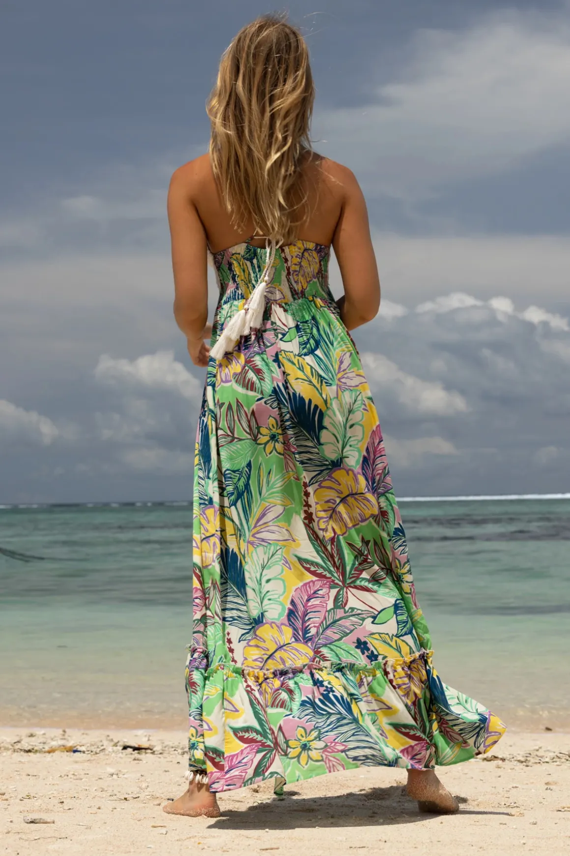 Mencia maxi dress features a crochet top, a long floral skirt with wide ruffle hem, and over the shoulder back ties adorned with tassels.