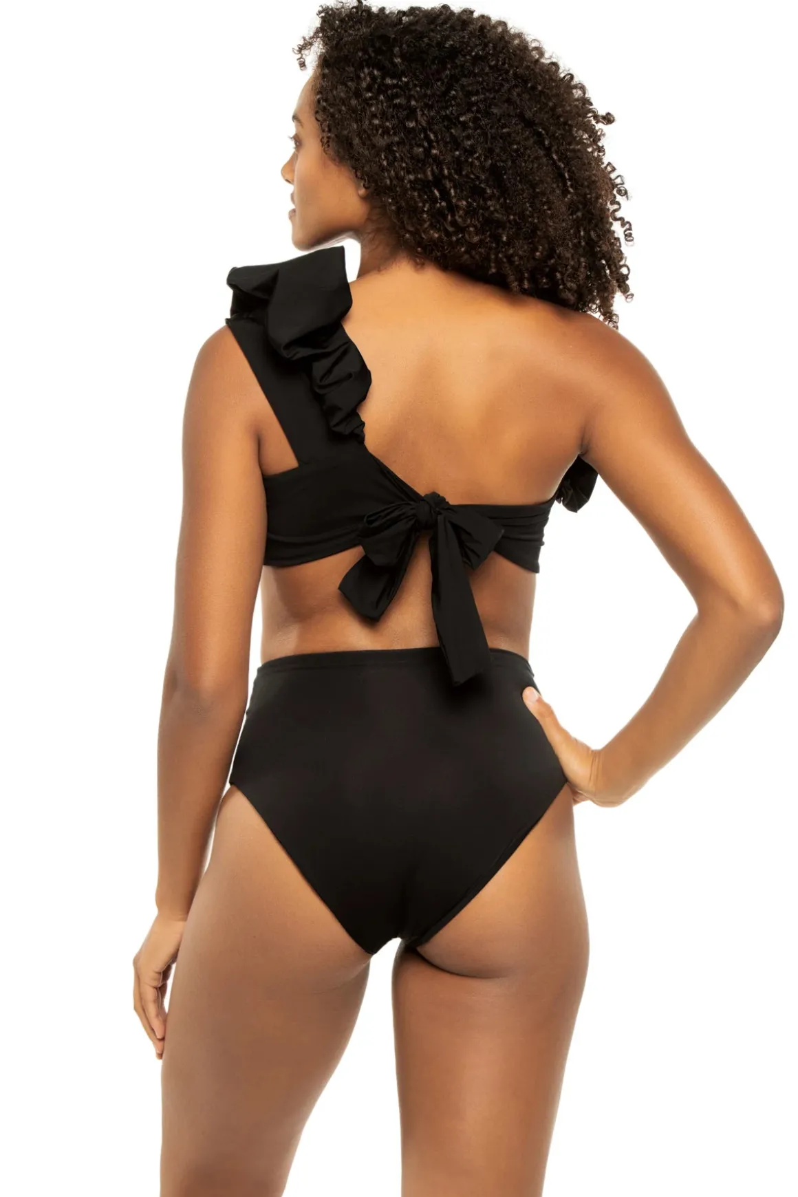 Merly bikini set features an asymmetrical top with puffy detail around the neckline and a back tie closure. A high waist bottom offers moderate coverage. Resistant to UV, chlorine, and sunscreen.