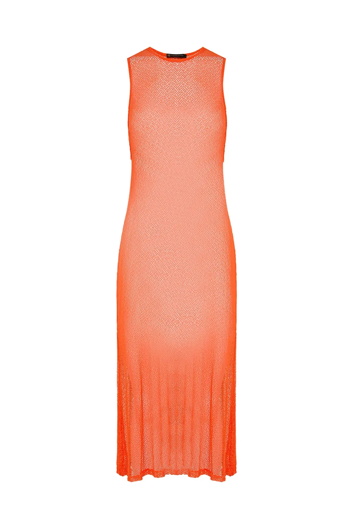 Midi dress features a mesh fabrication with a high neckline and dual side slits.