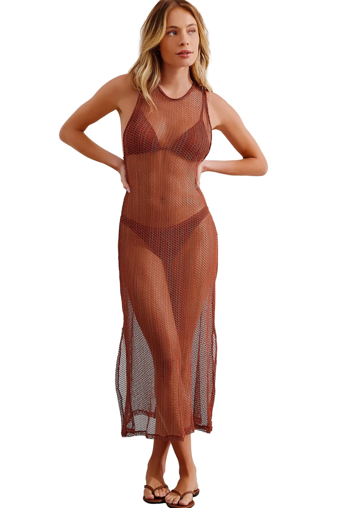 Midi dress features a mesh fabrication with a high neckline and dual side slits.