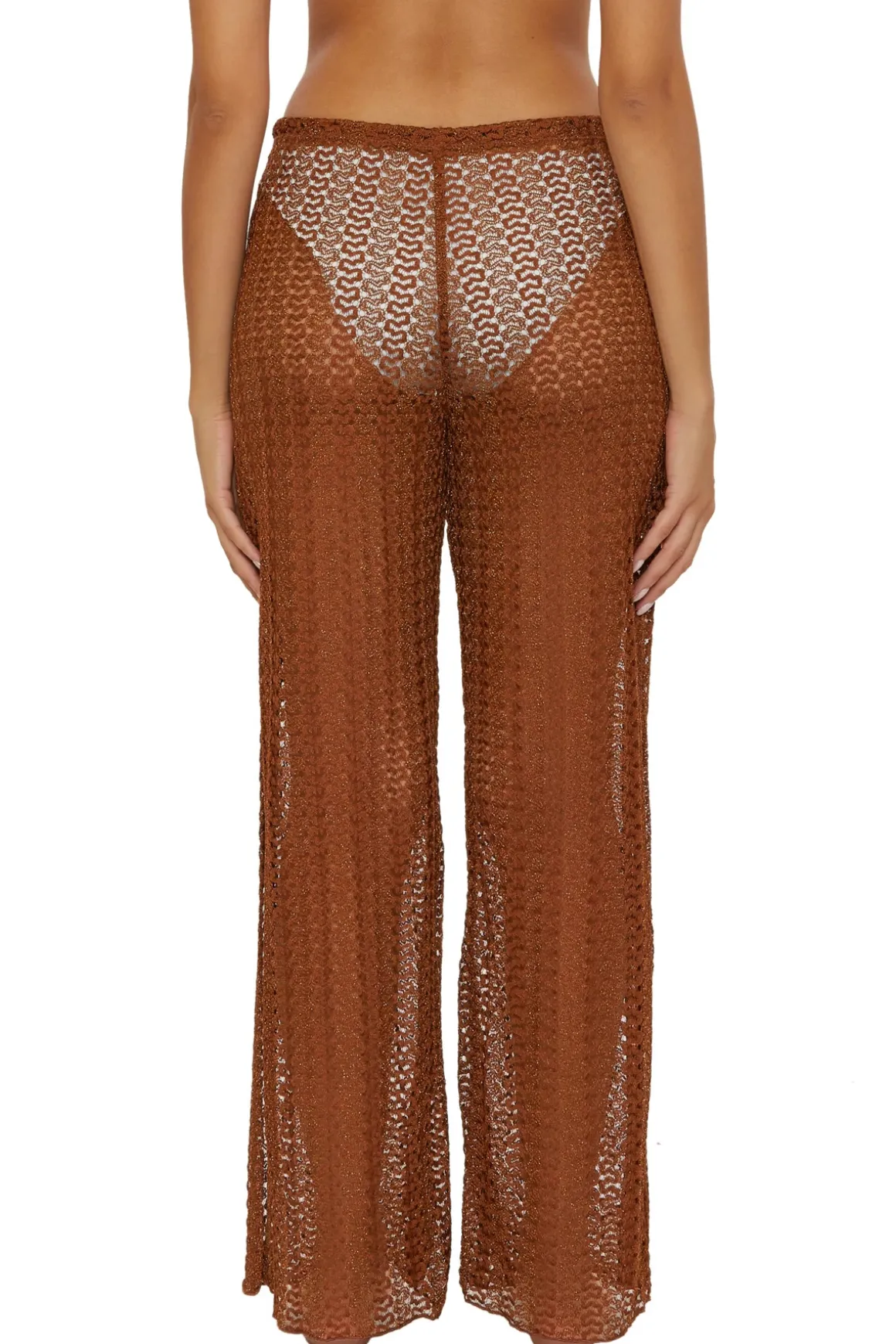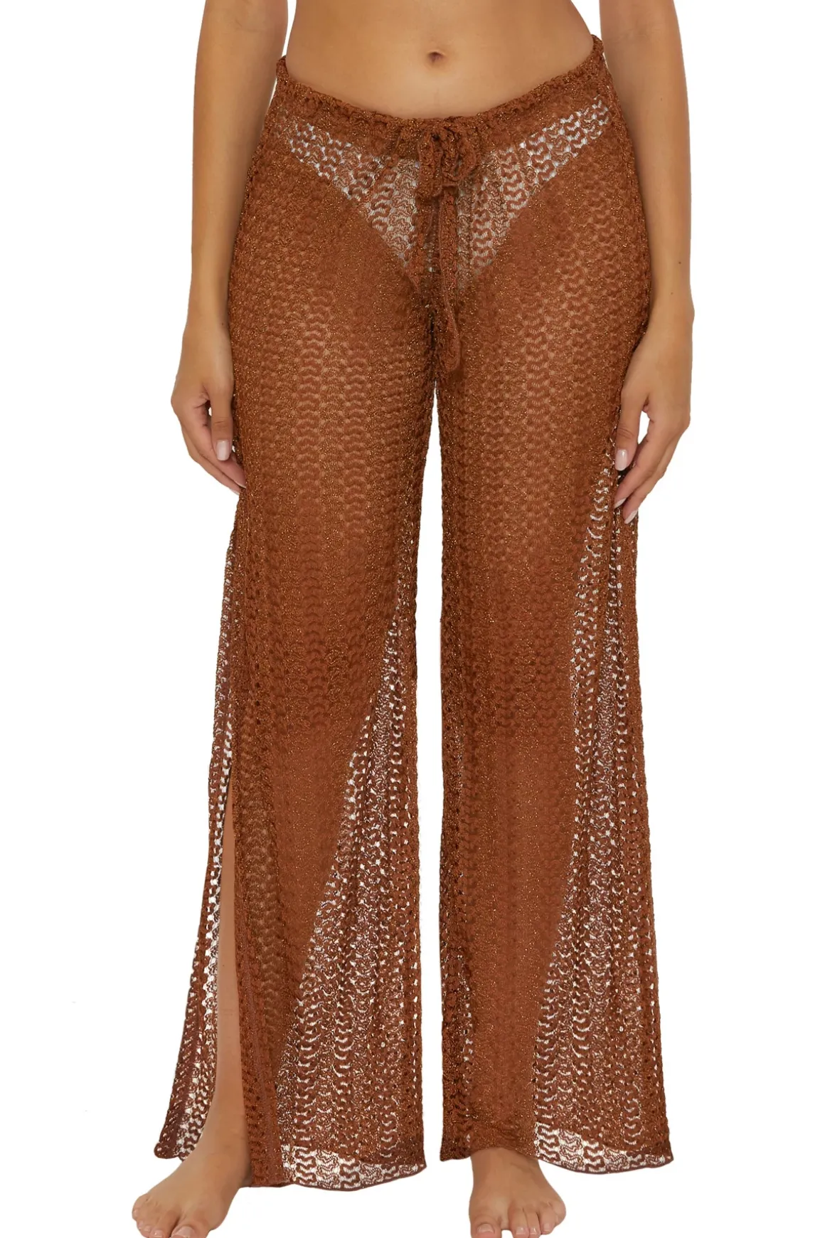 Cover up pants feature crochet lace with metallic details and offer side slits and a drawstring waist.