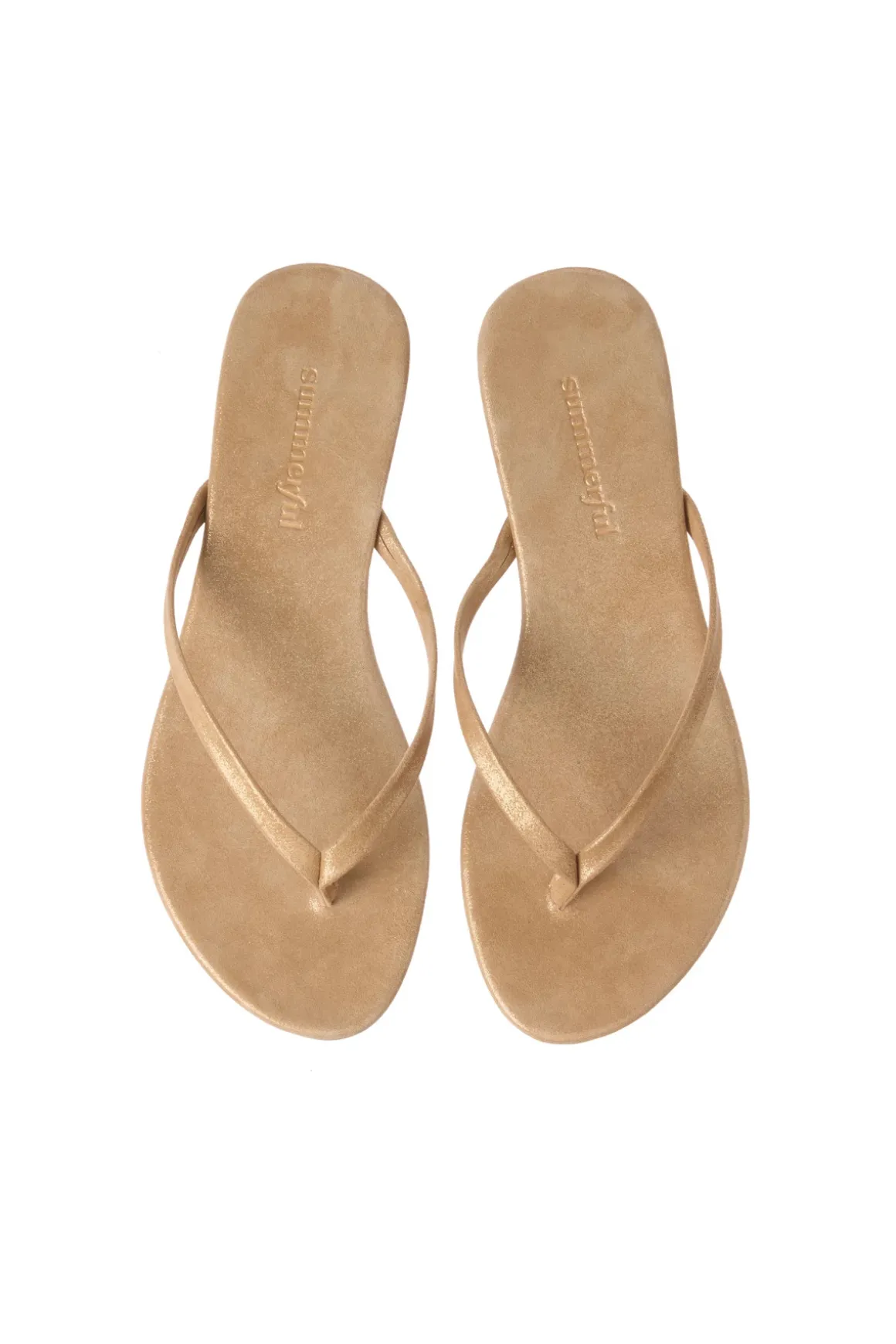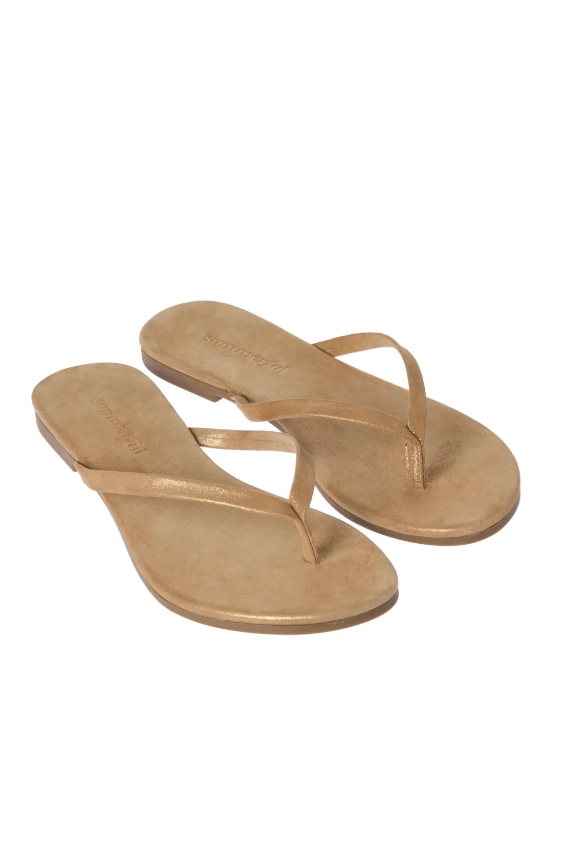 Metallic leather sandals feature thin thong straps, a rubber sole and a slightly elevated heel.