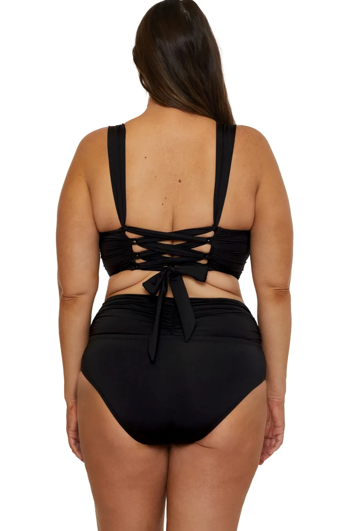 Mia bikini top features shirring throughout, scoop neckline, and wide supportive straps. Offers removable soft cups, reinforced side stays, and a lace-up tie back closure.
