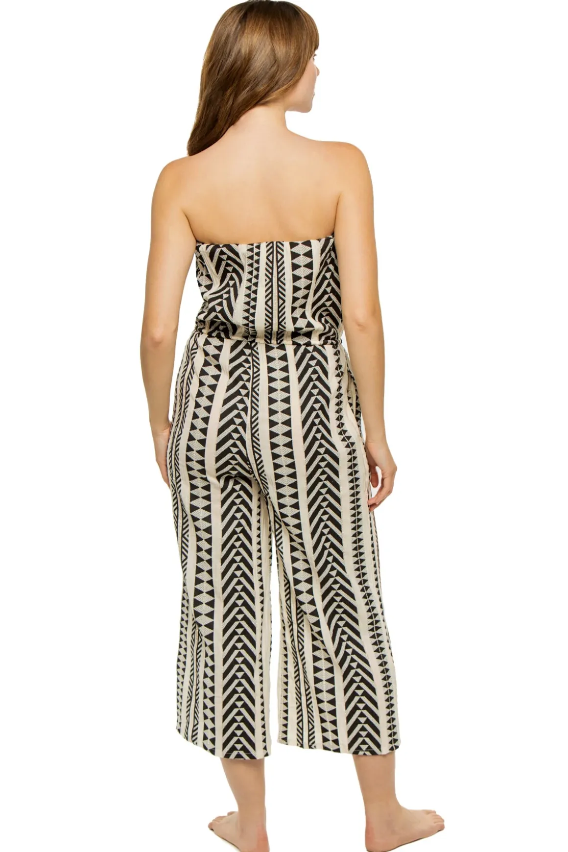 Jumpsuit features a tribal print, elastic neckline, side pockets and a drawstring waist.