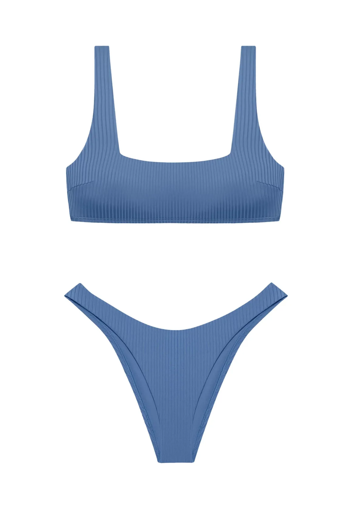 Bikini top features ribbed fabric, a square neckline, and fixed straps.