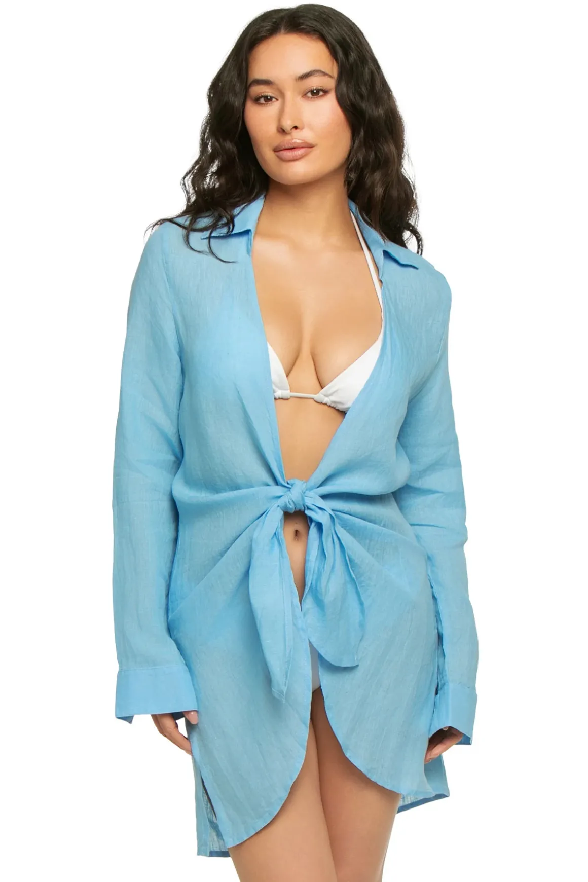Millie kimono offers a loose fit, adjustable tie front, collared neckline and long sleeves.