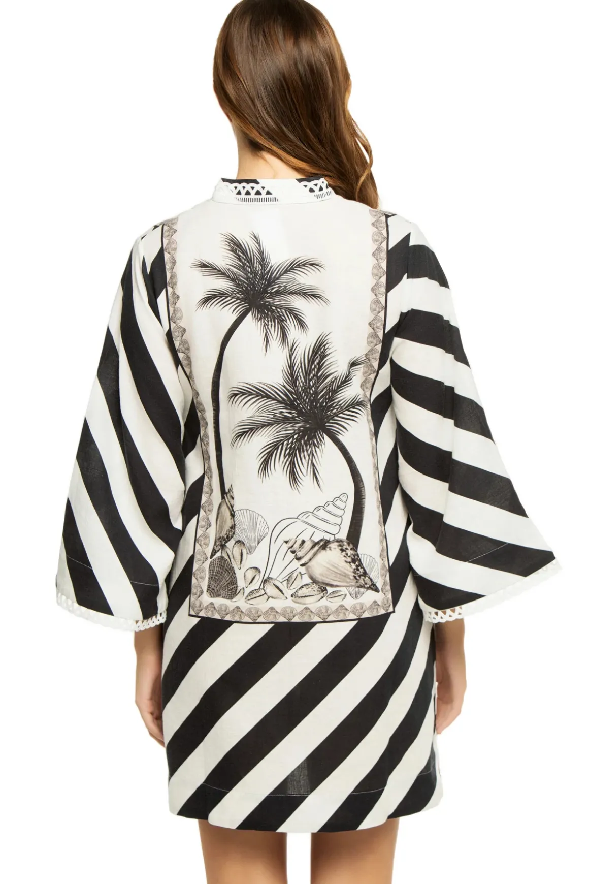 Mini caftan dress features striped print with a tropical front panel detail and crochet hem details on the sleeves. Offers a button up high neckline.