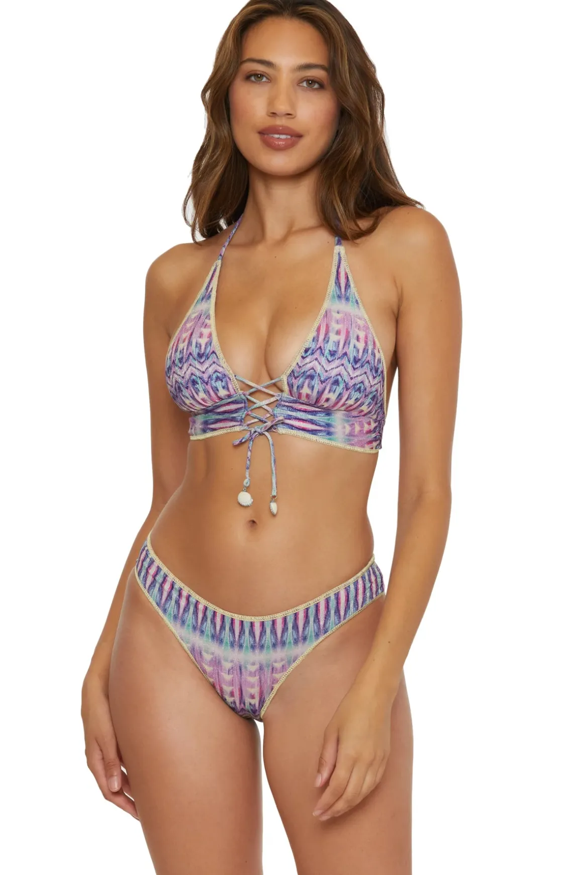 Mira halter bikini top laces up the front with thin ties adornedwith shell charms. Features metallic detailing and threaded edge stitching. Offers adjustable neck ties, removable soft cups, and a hook closure at back.
