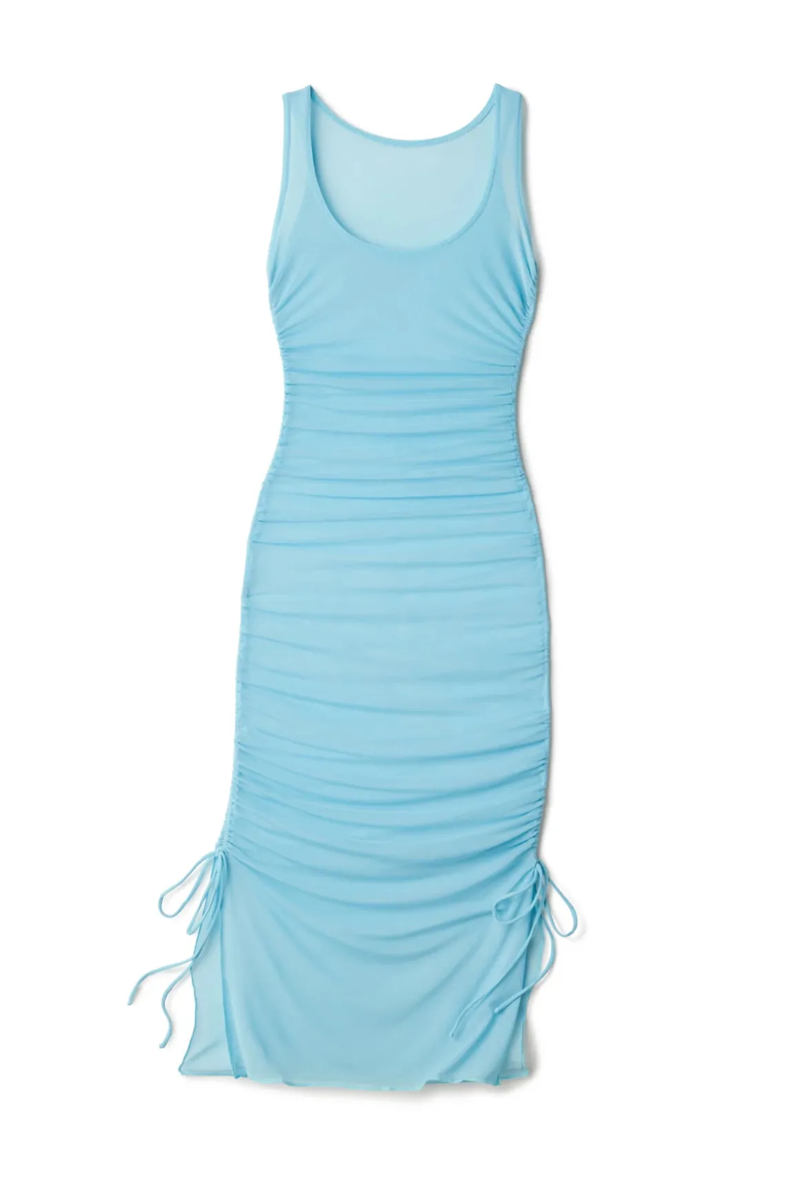 Muse mesh dress features shirred drawstring sides for adjustable coverage. Can be reversed front to back.