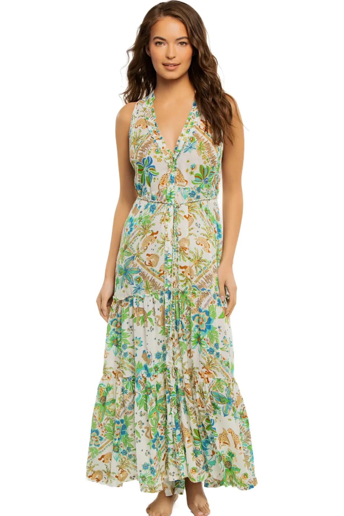 Nana dress features apetunia-inspired print, v-neckline and offers a button up front.