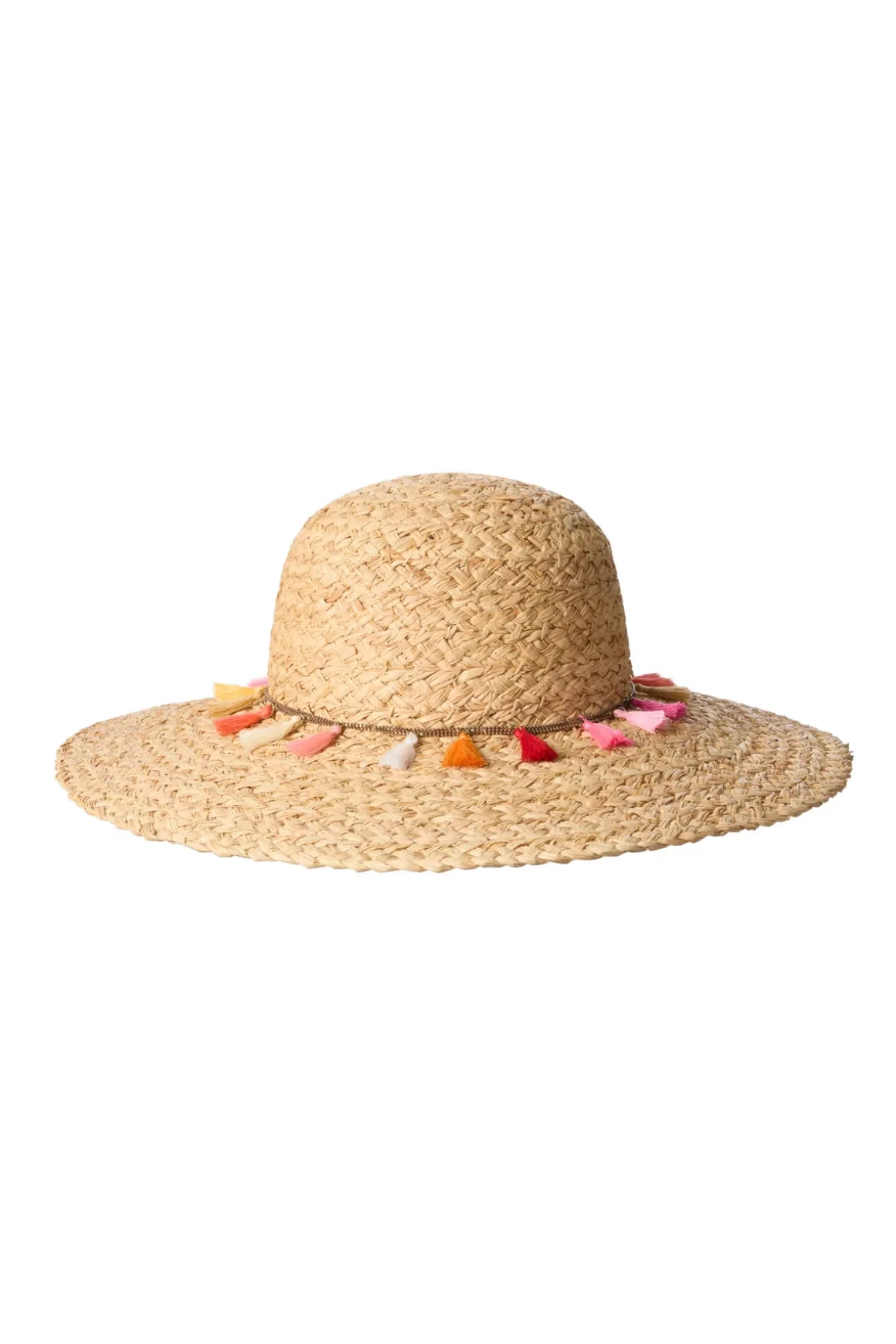 Neatly woven sun hat featuring a trim of vibrant colored mini tassels at base and a wide brim.