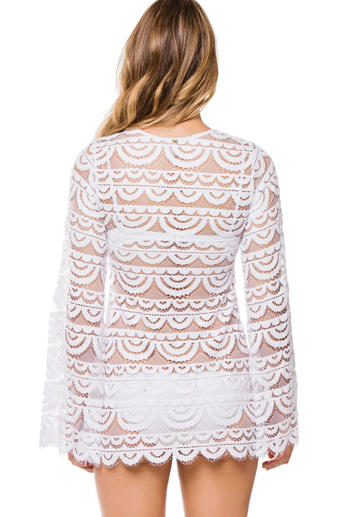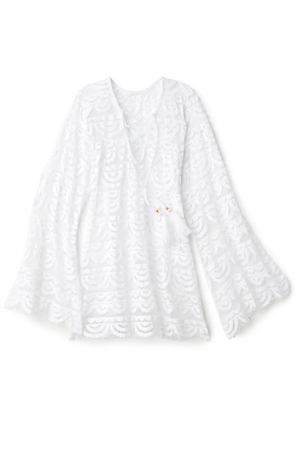 Noah crochet lace tunic with lace up tassel ties at front, long sleeves and scalloped hem.