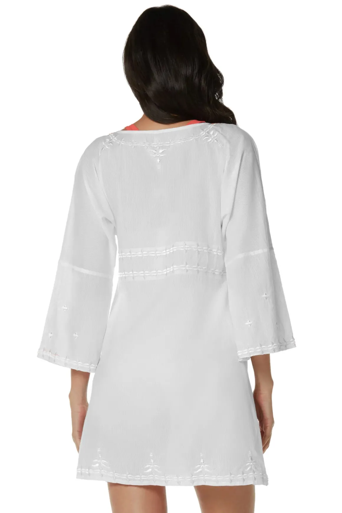 Nola tunic features intricate embroidery, flared sleeves and secures in front with two ties accented with fluffy tassels.