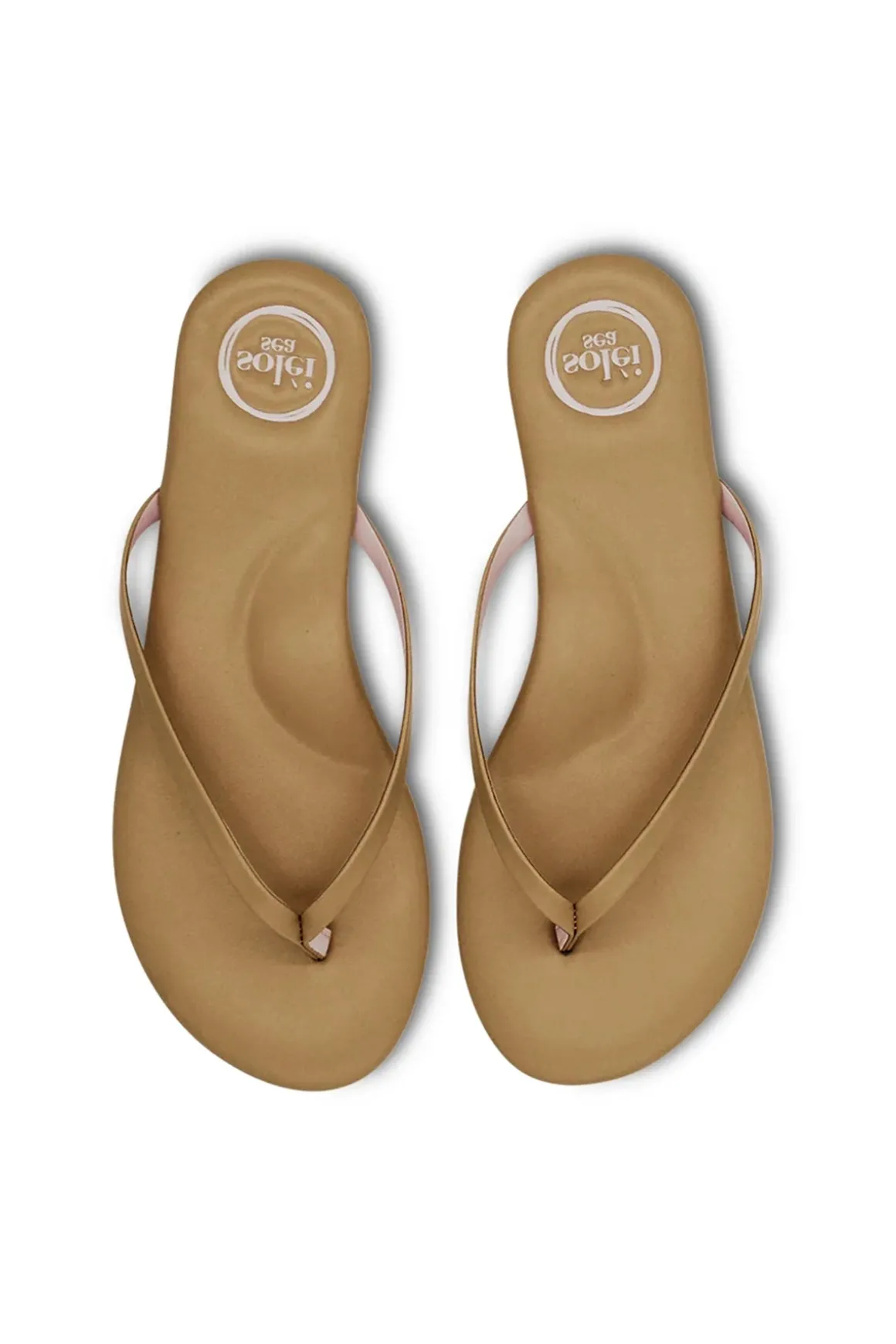 Nude water resistant flip flops feature pink accents, a vegan leather upper, built in arch support, cushioned footbed, and a non-slip recycled sole.