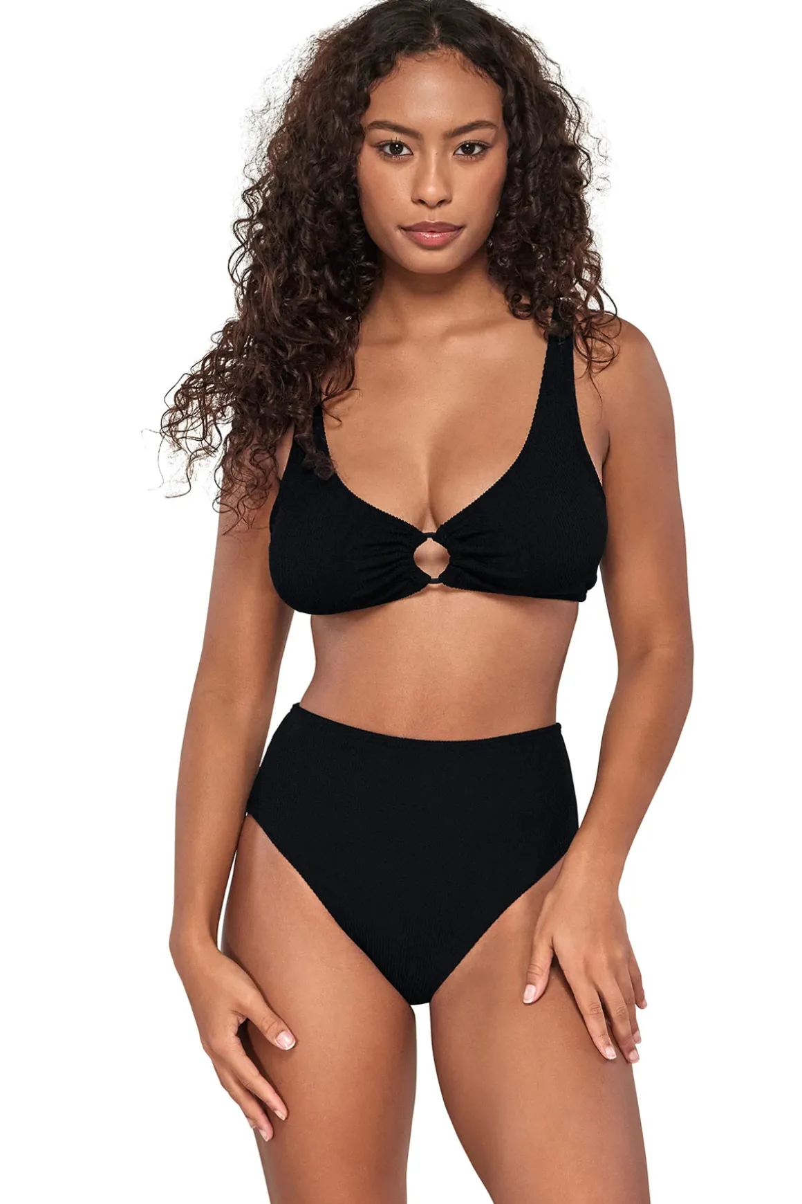 There’s nothing better for your beachside adventures than the Oceana top. Featuring a metal ring front with shirring that’s flattering, flirty and supportive. This top has a hook back closure, adjustable straps, j-hook, and removable cups for your comfort.