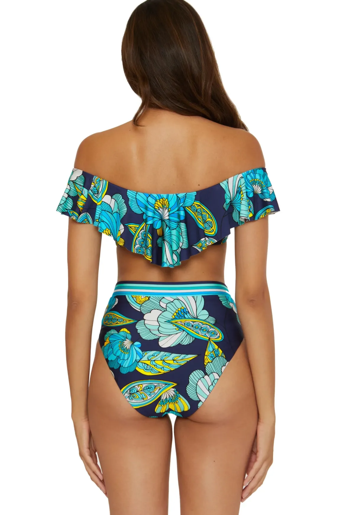 Bikini top features a floral print and offers a shelf bra with removable soft cups.
