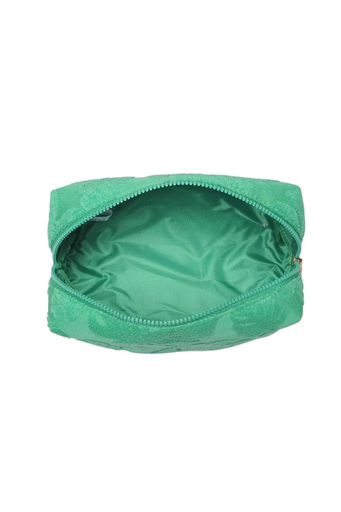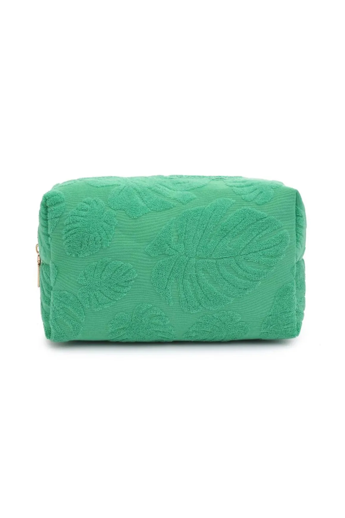 Pouch features textured terry cloth with intricate leaf patterns, lightweight yet durable, perfect for storing daily essentials. Offers a secure zipper closure.
