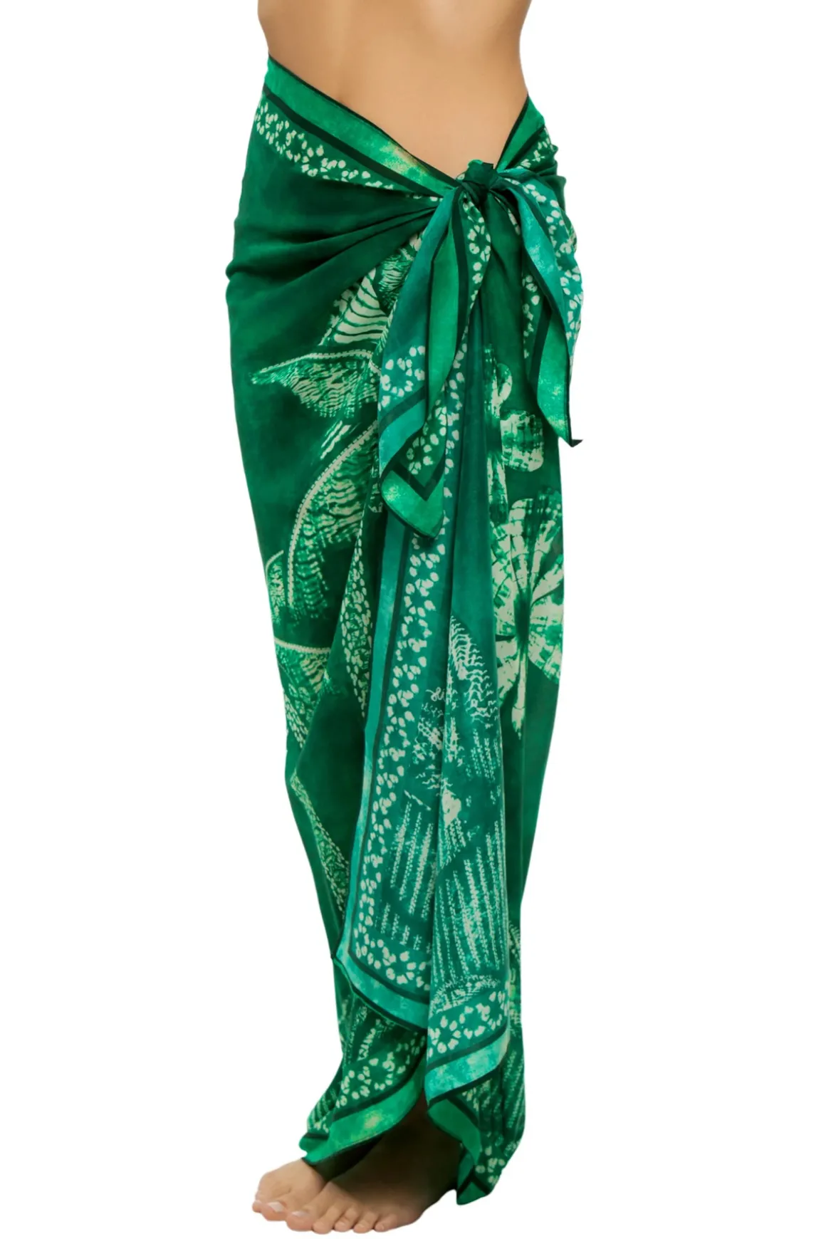 Palm tides pareo features tie-dye inspired tropical print and a self tie closure.