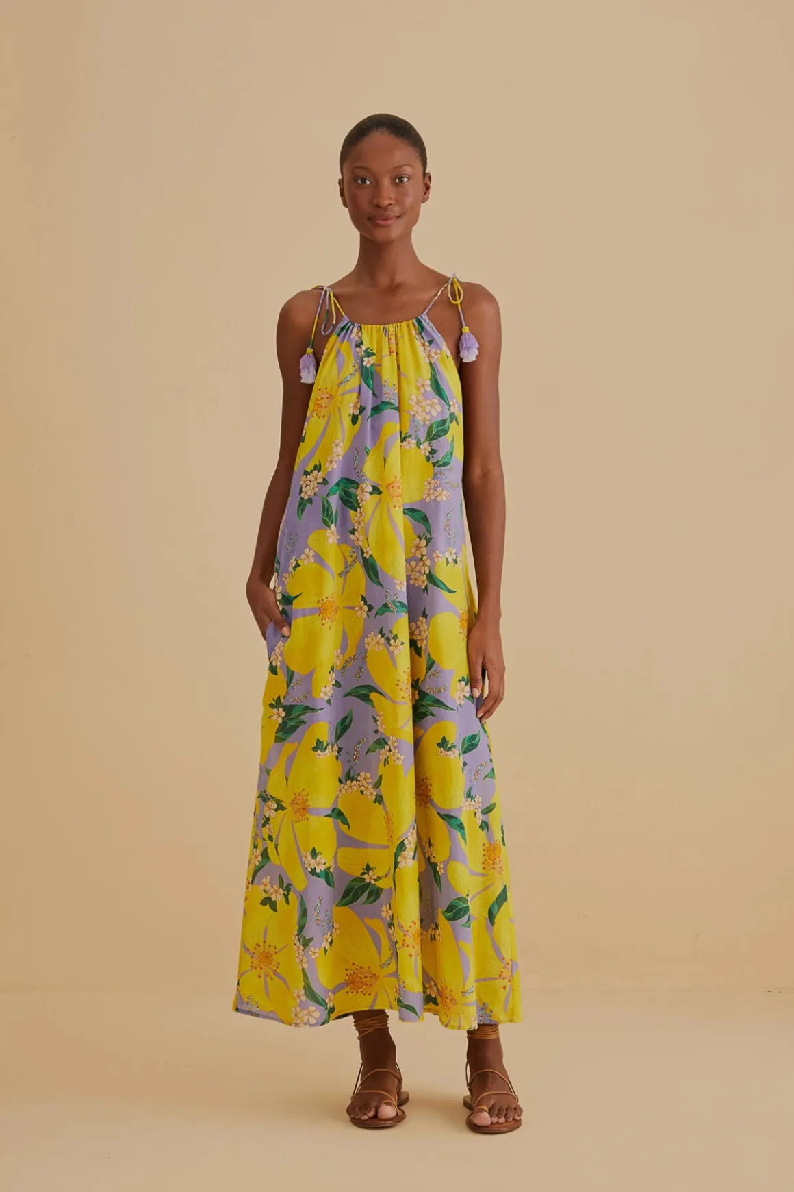 Pietra maxi dress features floral print and drawstring adjustable straps with tassel ends.