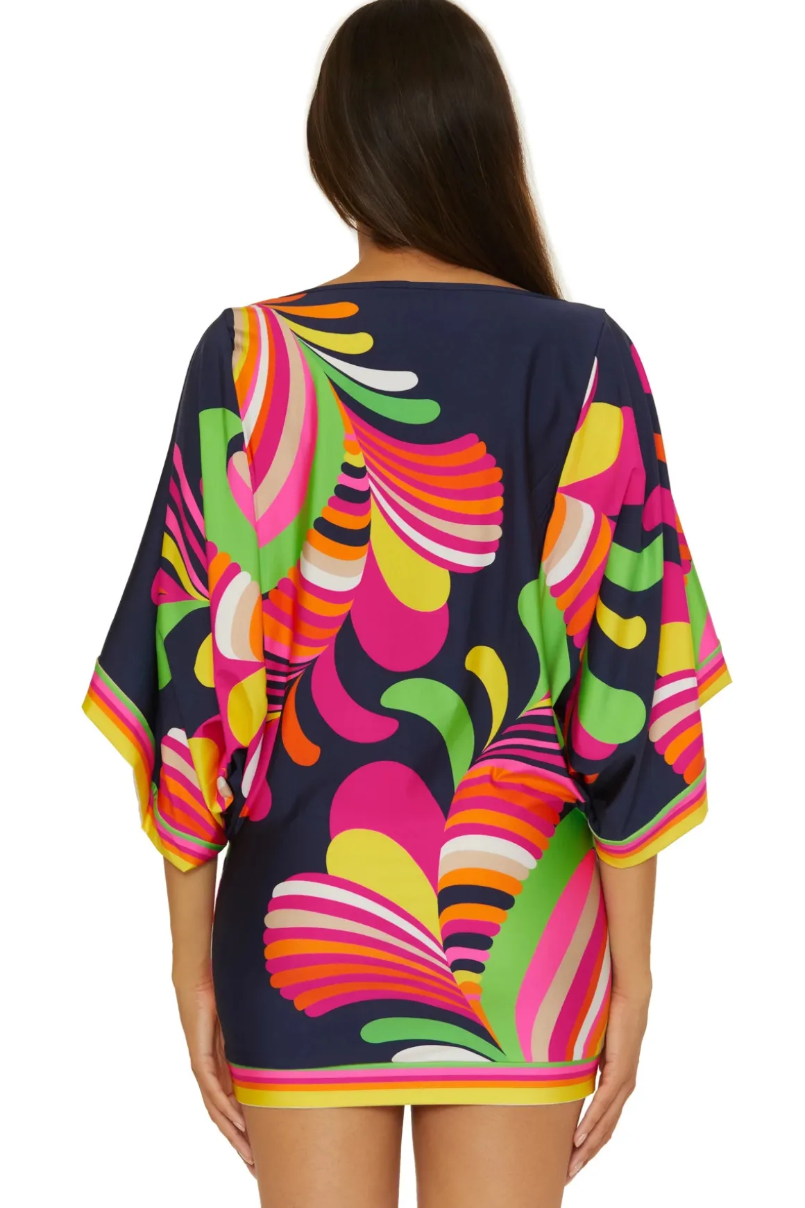 Tunic can be worn as a swim cover up, a mini dress or as a top. Features 3/4 length wide sleeves and is fitted at hips.