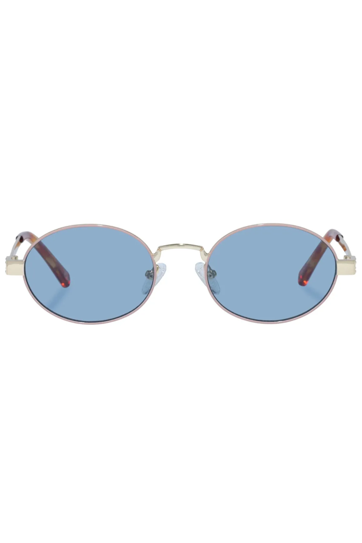 Poseidon Deux is a unisex ’90’s inspired oval silhouette, featuring a sleek and slim line gold metal frame with teal tint lenses.