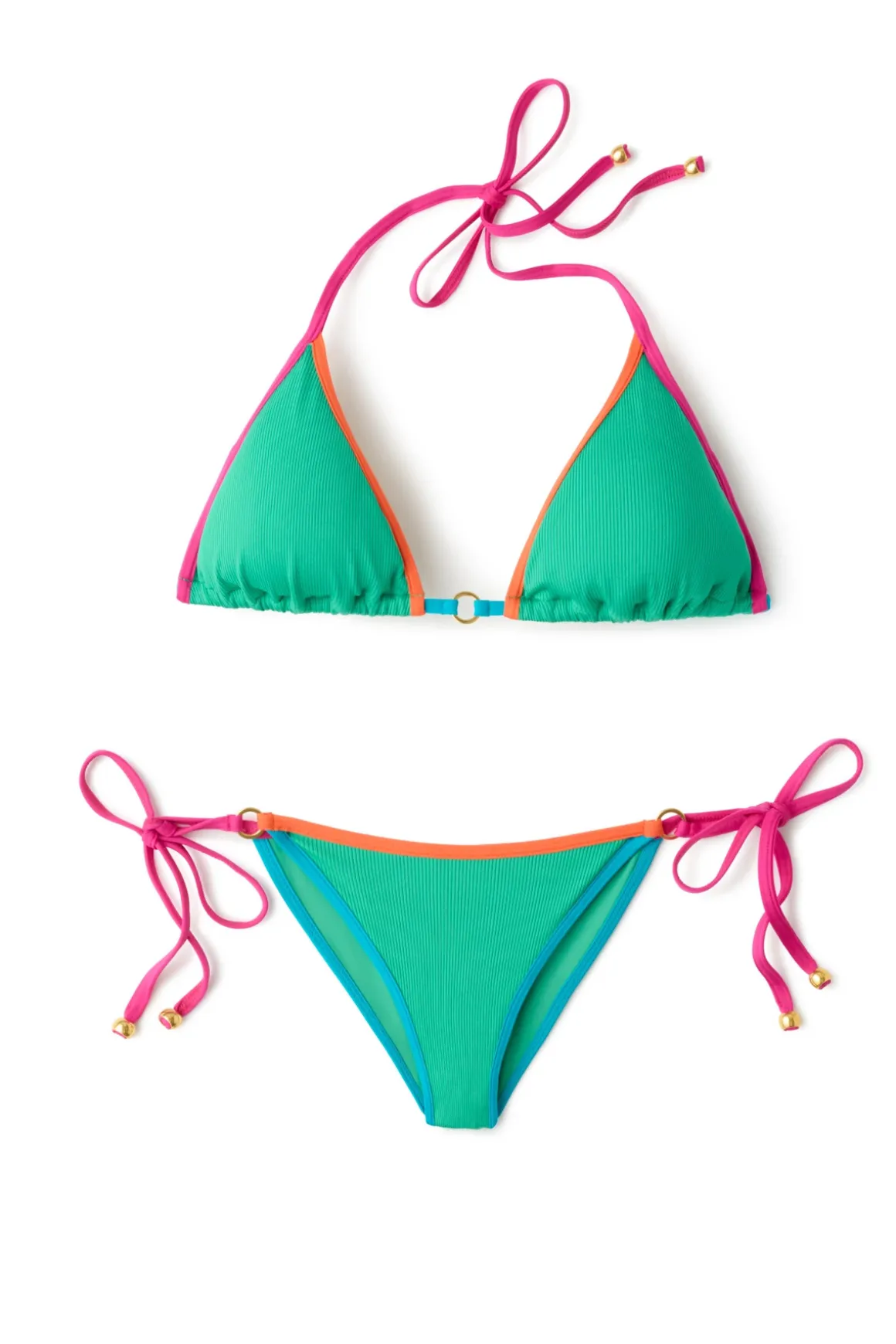 Positano ribbed bikini top features colorblock piping and a gold ring detail. Offers adjustable neck and back ties.
