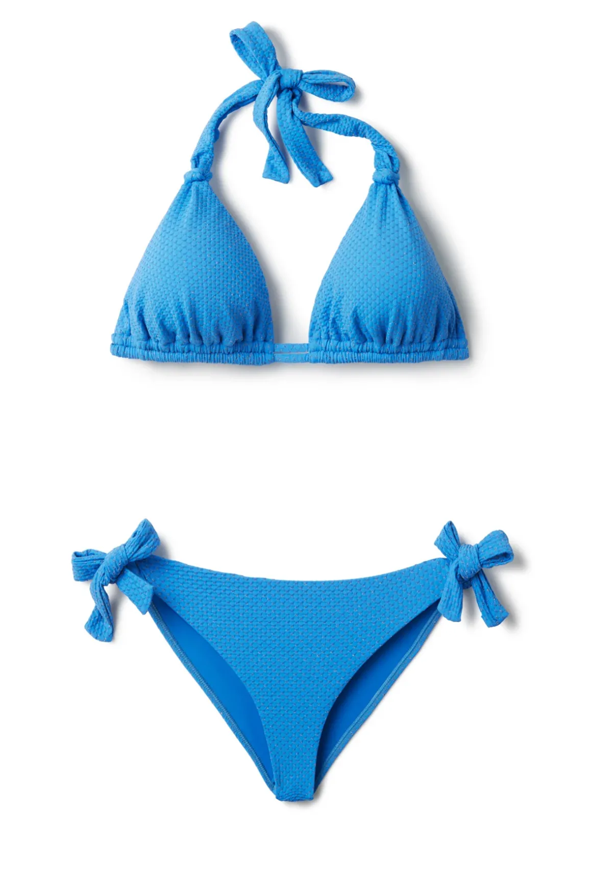 Riley halter bikini top features a recycled pique textured fabrication with sliding knots for personalized coverage and removable cups. Offers a double under bust band and power mesh for additional lift and support. Tailored to fit cup sizes C to F.
