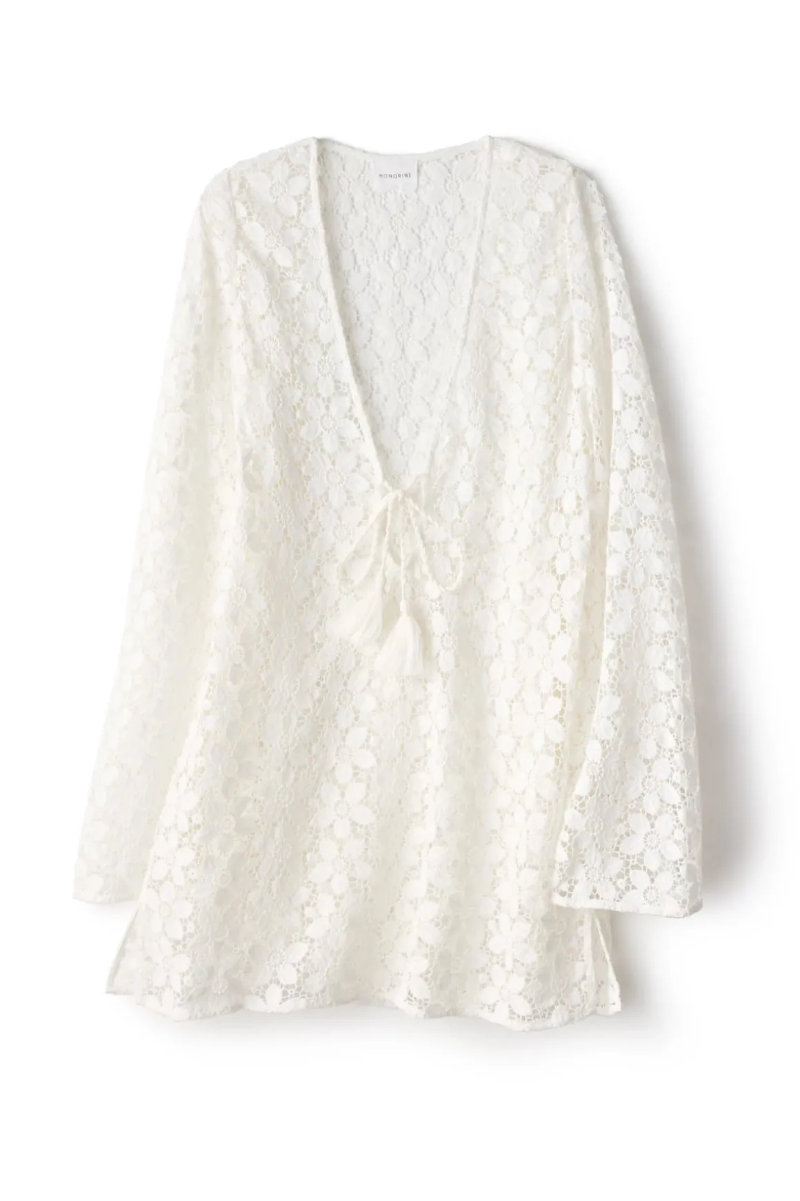Rosie mini dress features delicate floral lace with charming tassel ends, a flattering v-neckline, and long sleeves.