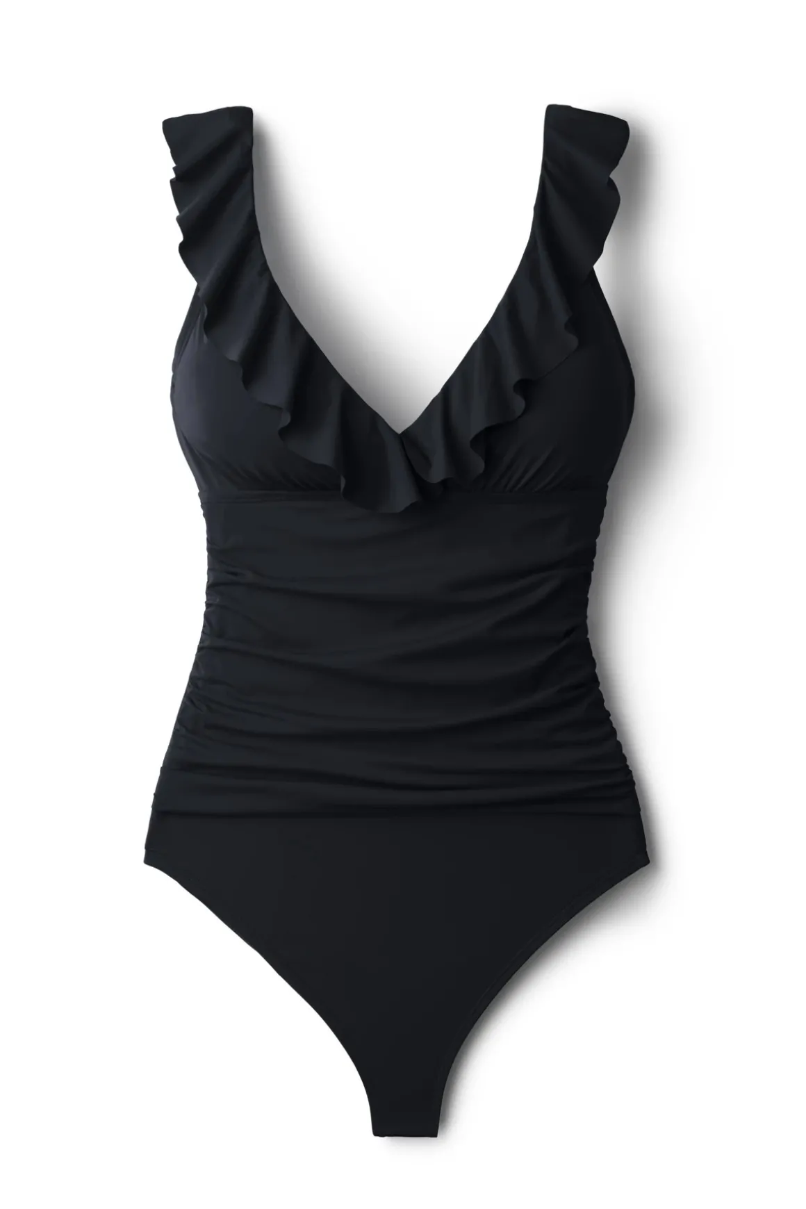 One piece swimsuit features a ruffled neckline and a shirred bodice with tummy control. Offers removable soft cups and moderate bottom coverage.
