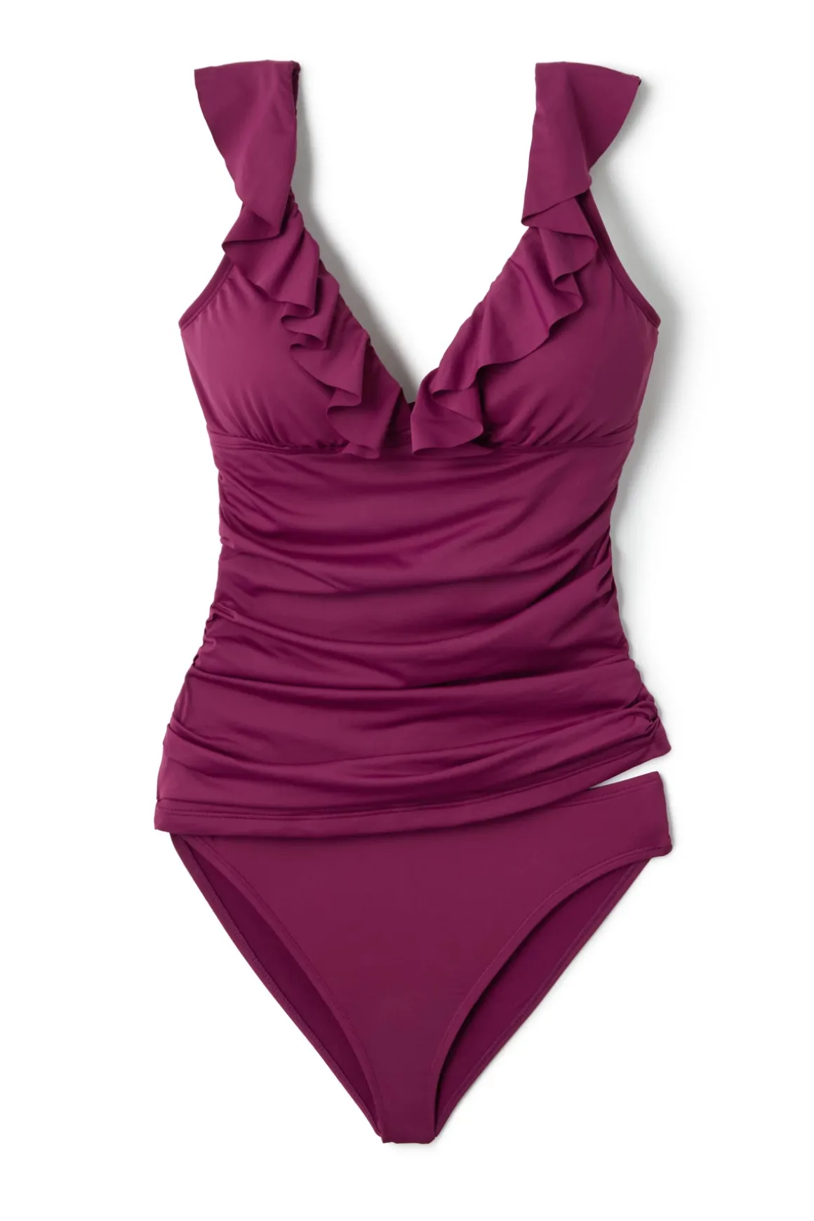 Tankini top features a ruffled v-neckline and offers removable soft cups and adjustable straps.