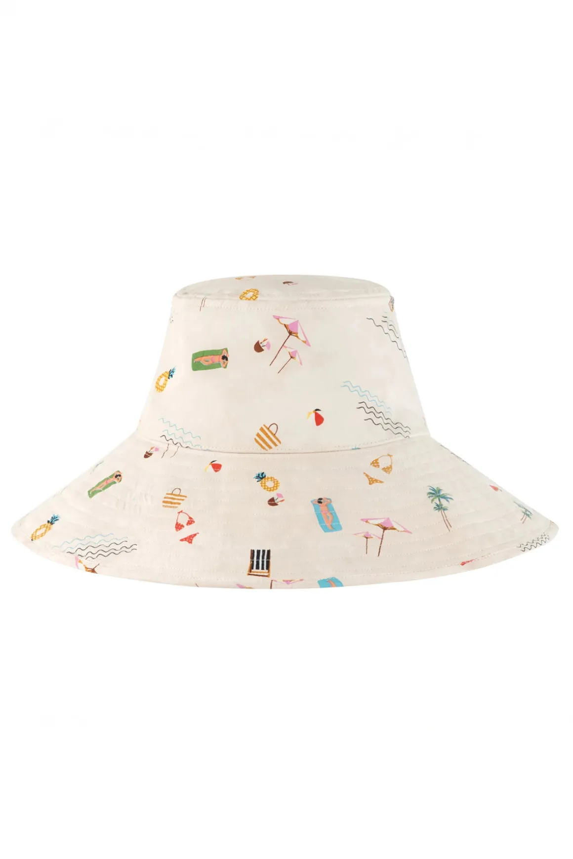 Sandbar bucket hat features an ivory base with colorful beach scene, crafted from soft cotton.
