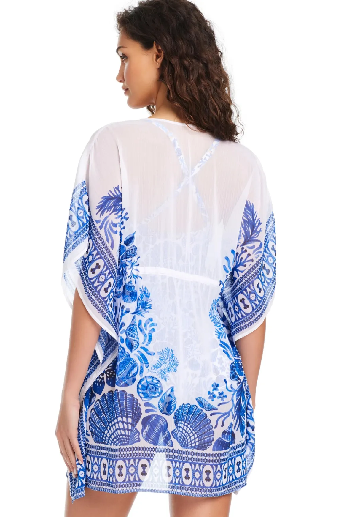 Caftan features a plunging neckline, and a front tie adorned with tassel accents.