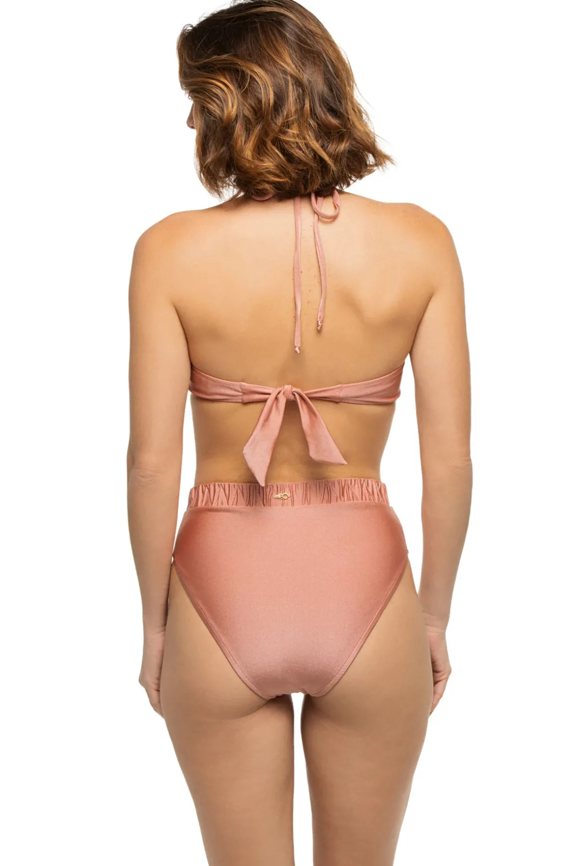 Bandeau bikini top adorned with large center seashell detail, ties at neck and back.