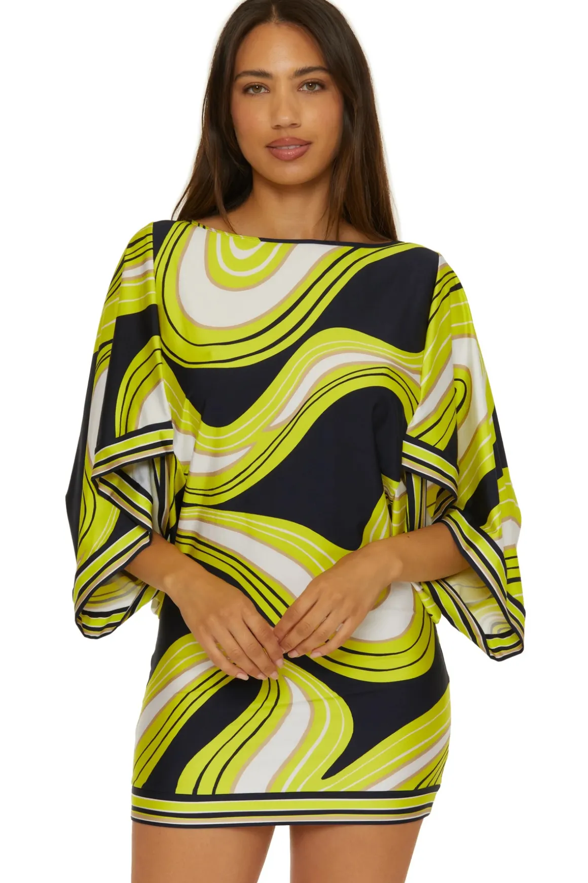 Tunic can be worn as a swim cover up, a mini dress or as a top. Features 3/4 length wide sleeves and is fitted at hips.