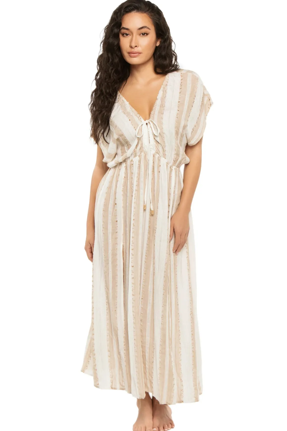 Maxi dress features shimmer detailed fabric, plunging neckline, short bell sleeves, and side slits.
