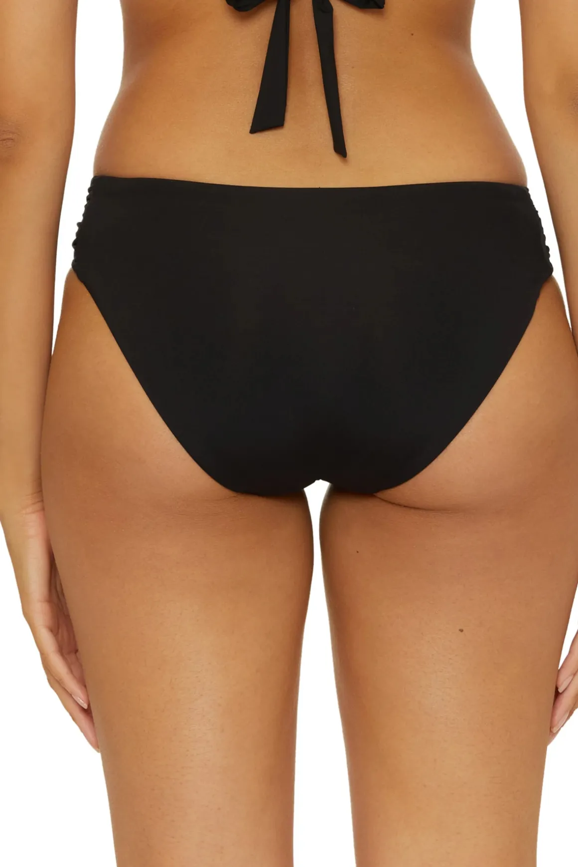 Hipster bikini bottom features shirred tab side detail and offers moderate bottom coverage.