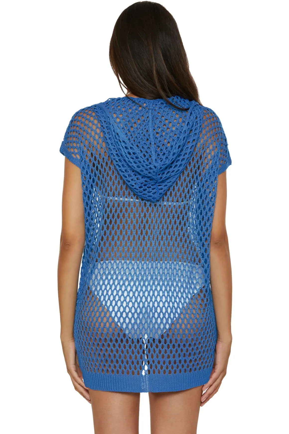 Tunic features open weave crochet, short sleeves, a hood, and a front tie with tassel details.
