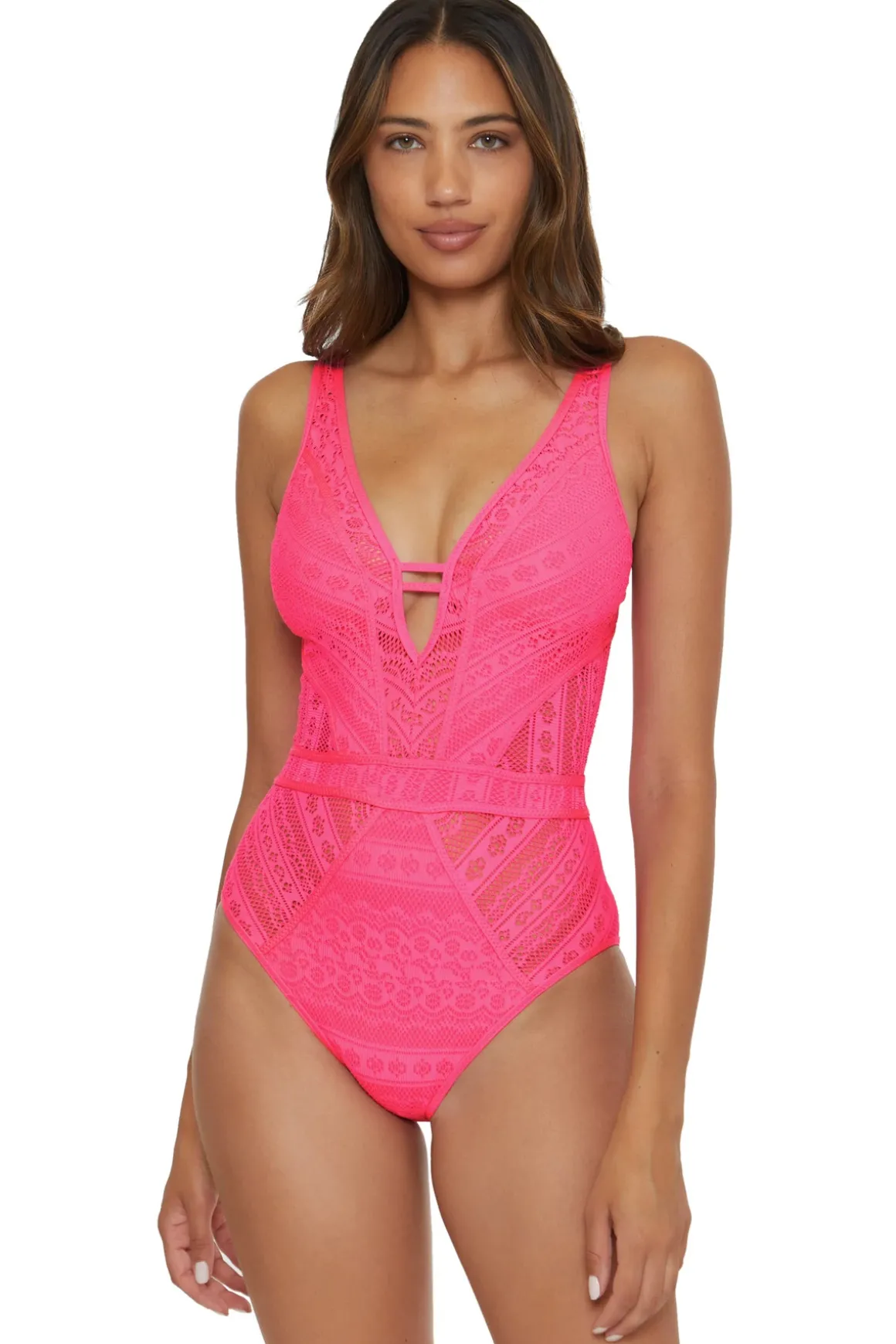 Show & Tell one piece swimsuit features a plunging neckline, sheer crochet insets with binding, diagonal inset seaming, front ladder tabs, and removable soft cups. Offers an open back with adjustable shoulder straps, back ties, and moderate coverage.