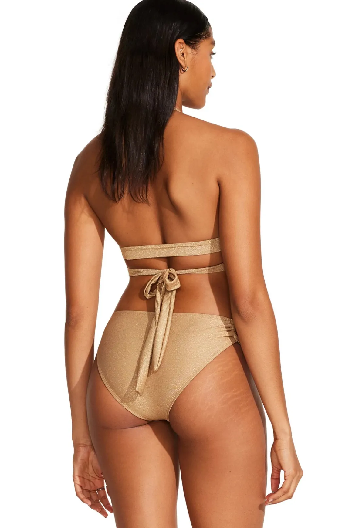 Sirena shimmer halter bikini top features wrap under bust straps, removable soft cups, and adjustable neck and back ties.