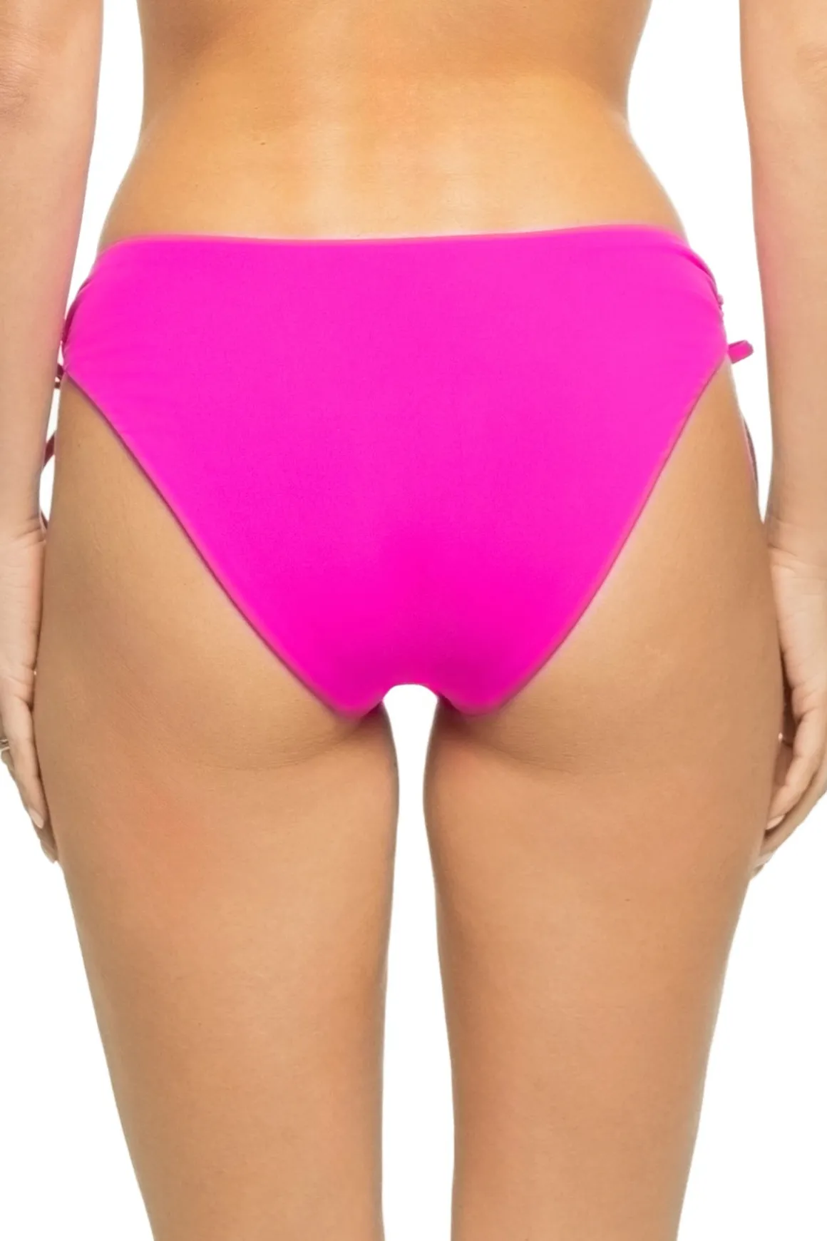 Socialite hipster bikini bottom features adjustable loop tie sides, ruffle detail and offers moderate coverage.