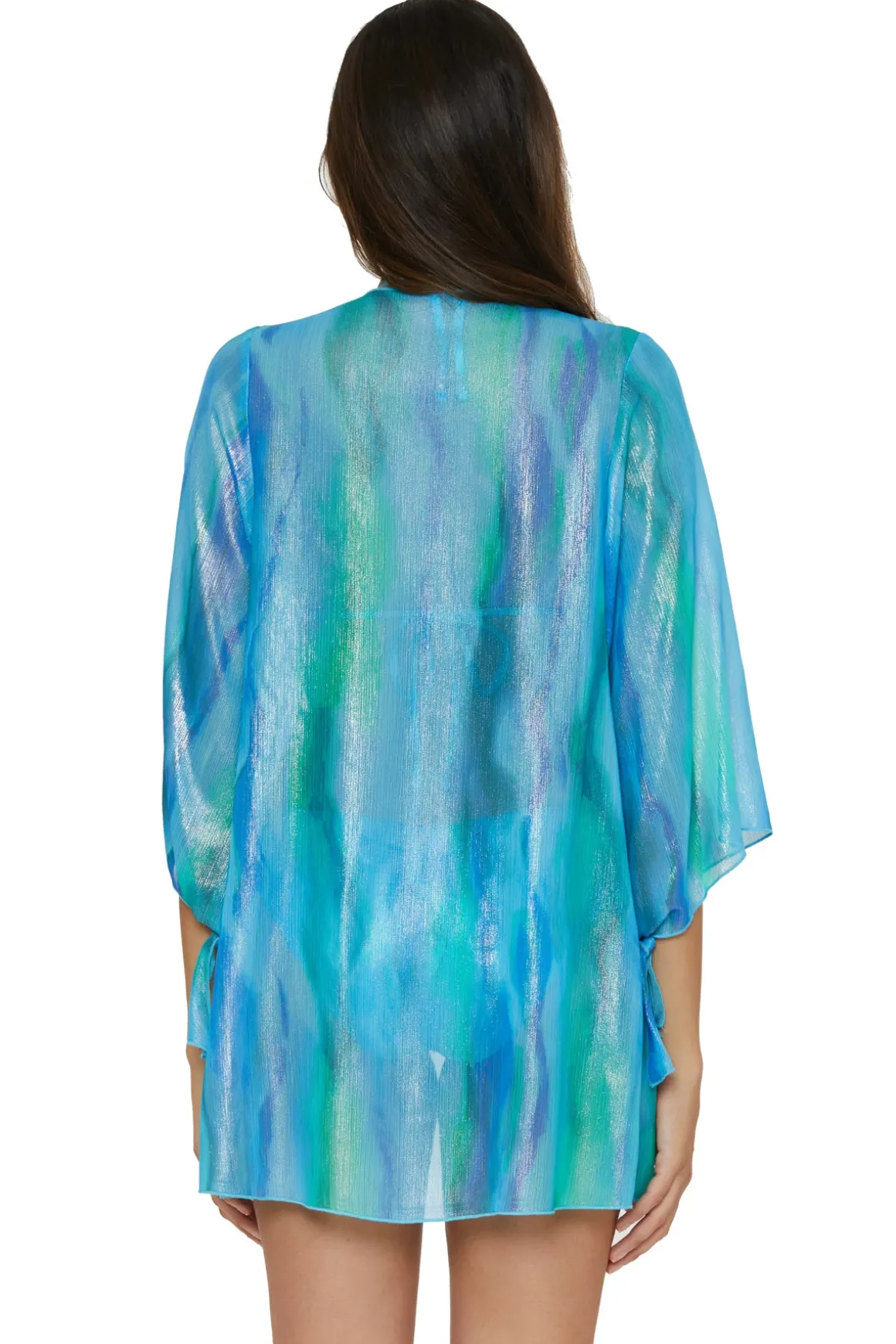 Kimono features metallic tie die print, 3/4 sleeves with tie details, and a front tie closure.
