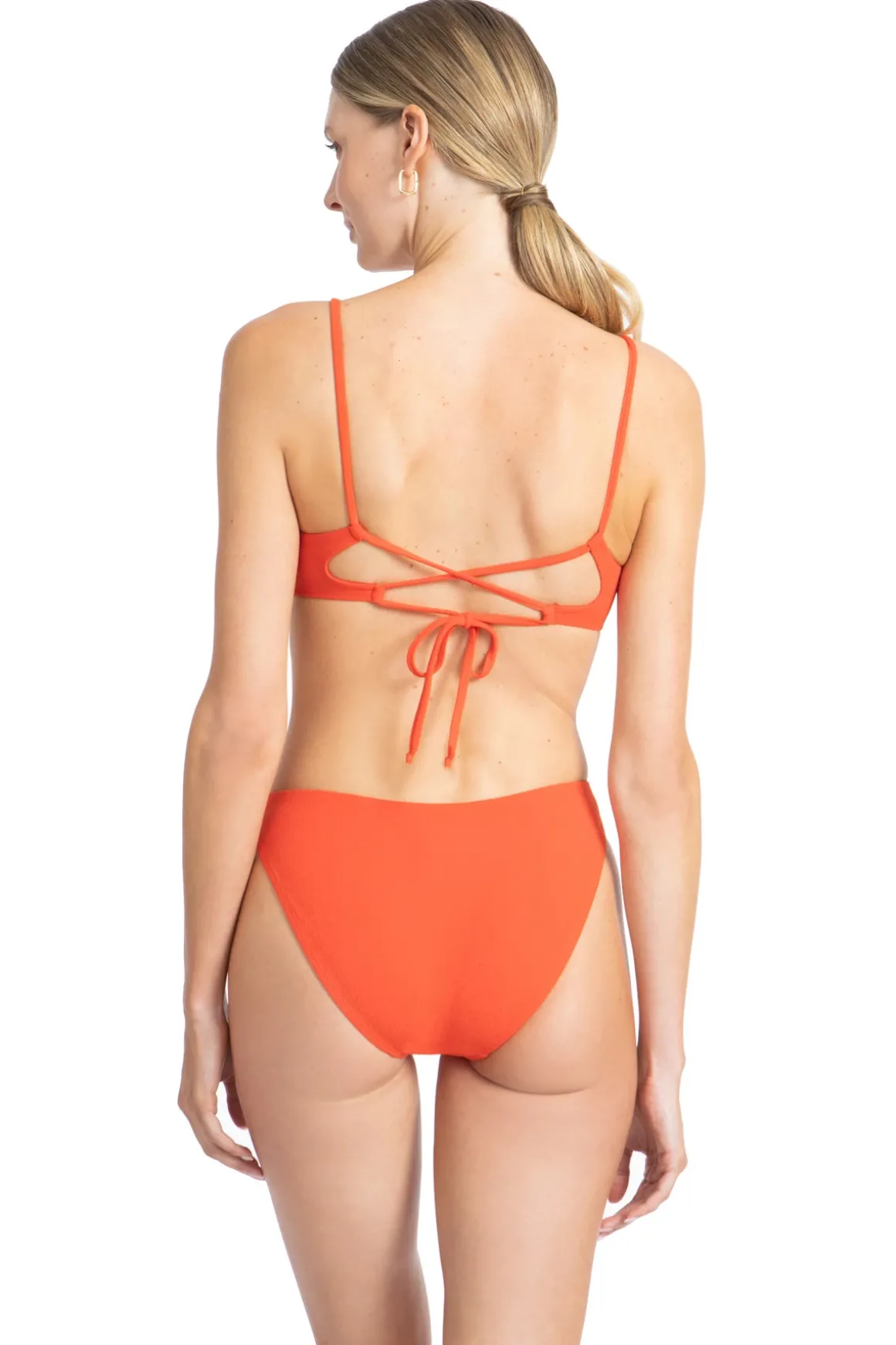 Soleil bikini top features a textured fabric with rope and tassel details. Offers removable cups, adjustable straps and lace-up ties at back.