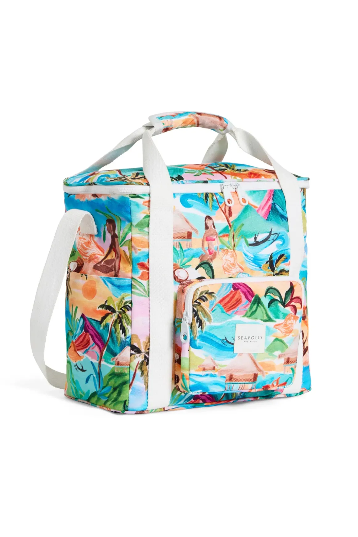 Cooler bag features adjustable straps, a zippered main compartment, and convenient front and side pockets with zippers.
