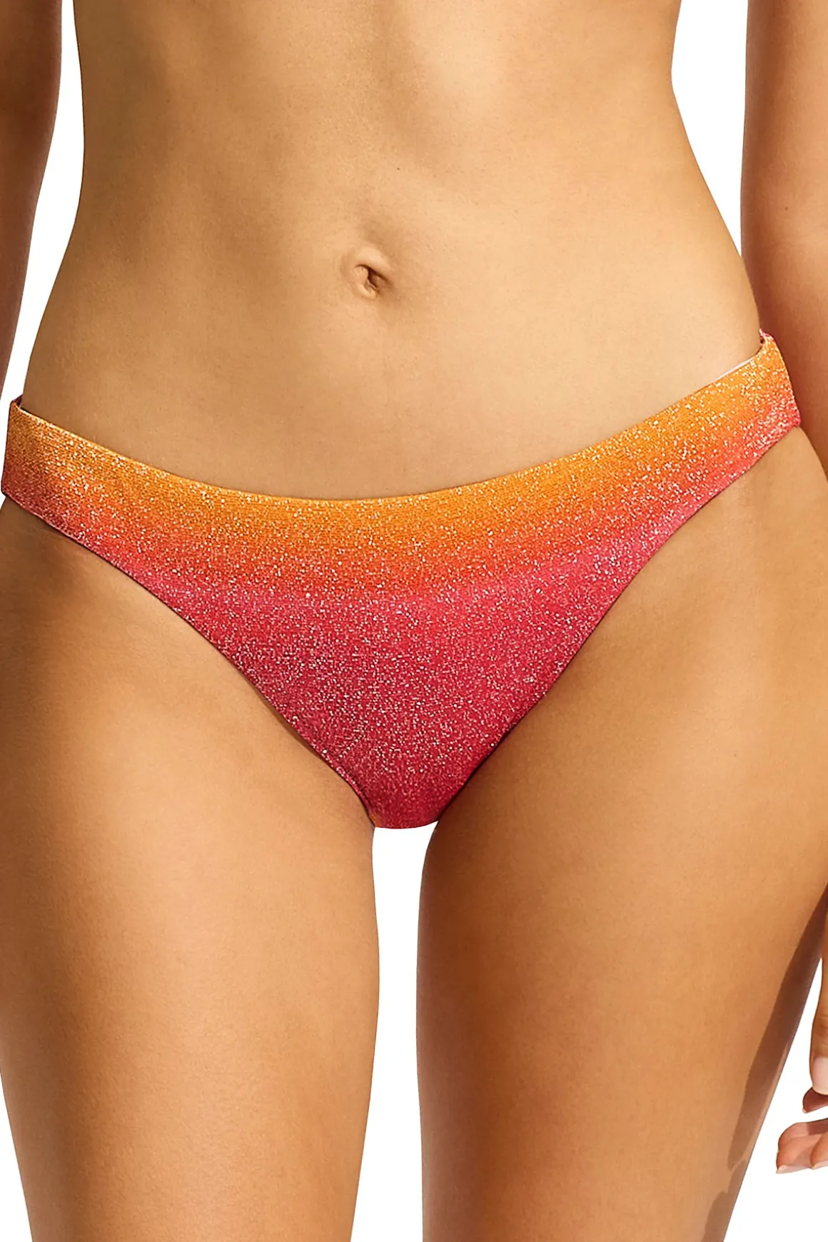 Hipster bikini bottom features warm metallic ombre print and offers moderate coverage.