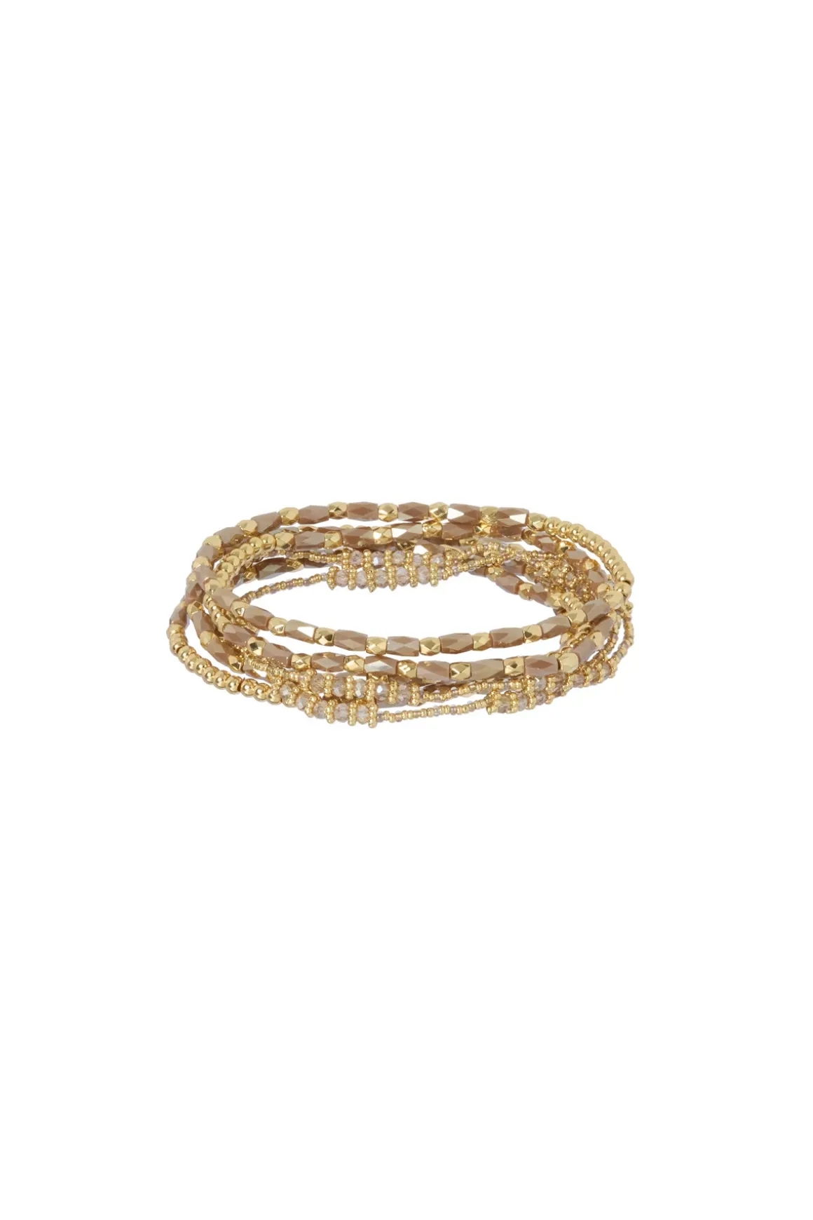 Bracelet features silver and gold beads stacked in a set of seven.