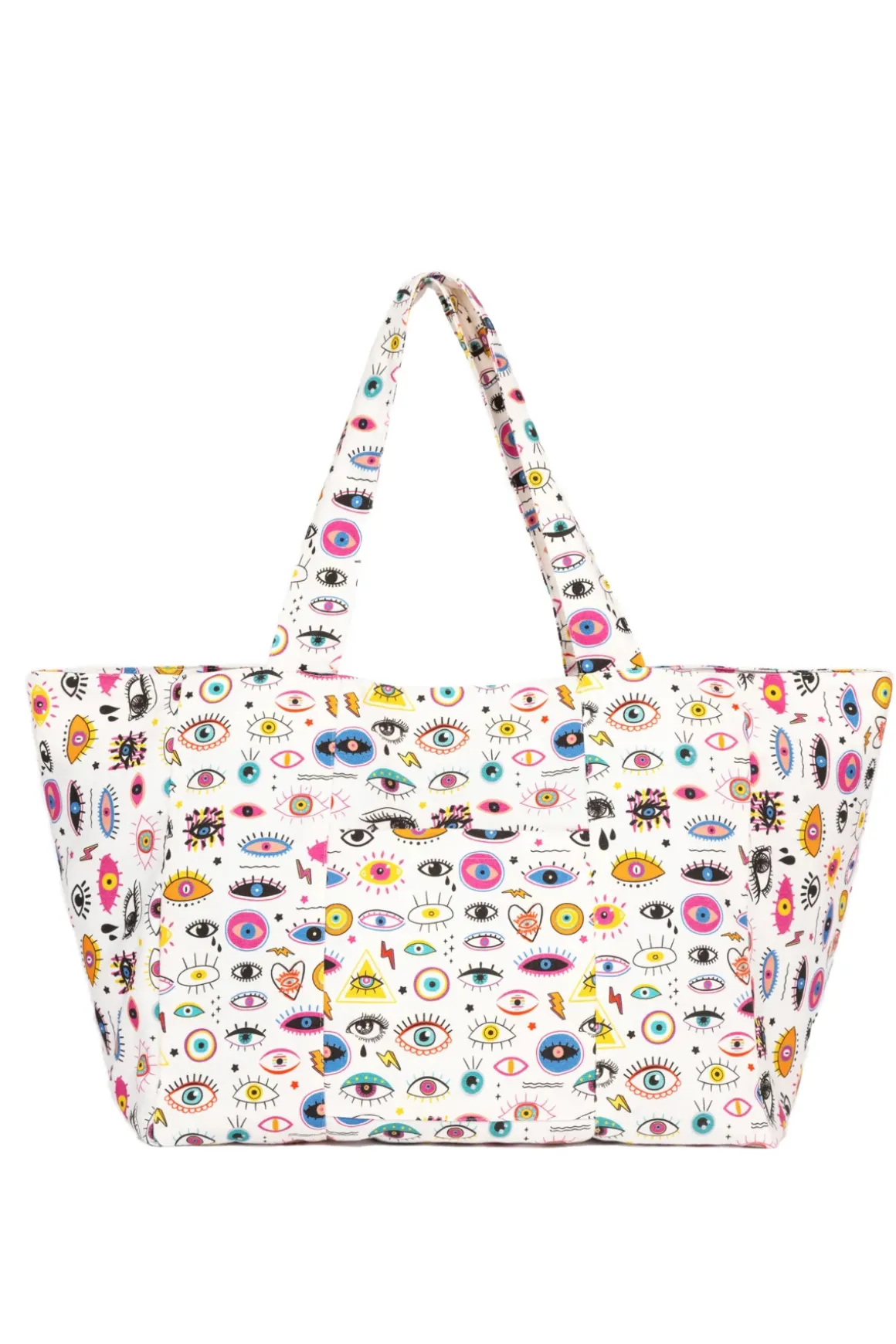 Starry eyes tote bag features evil eye printed canvas with soft dual drop handles and offers interior pockets.