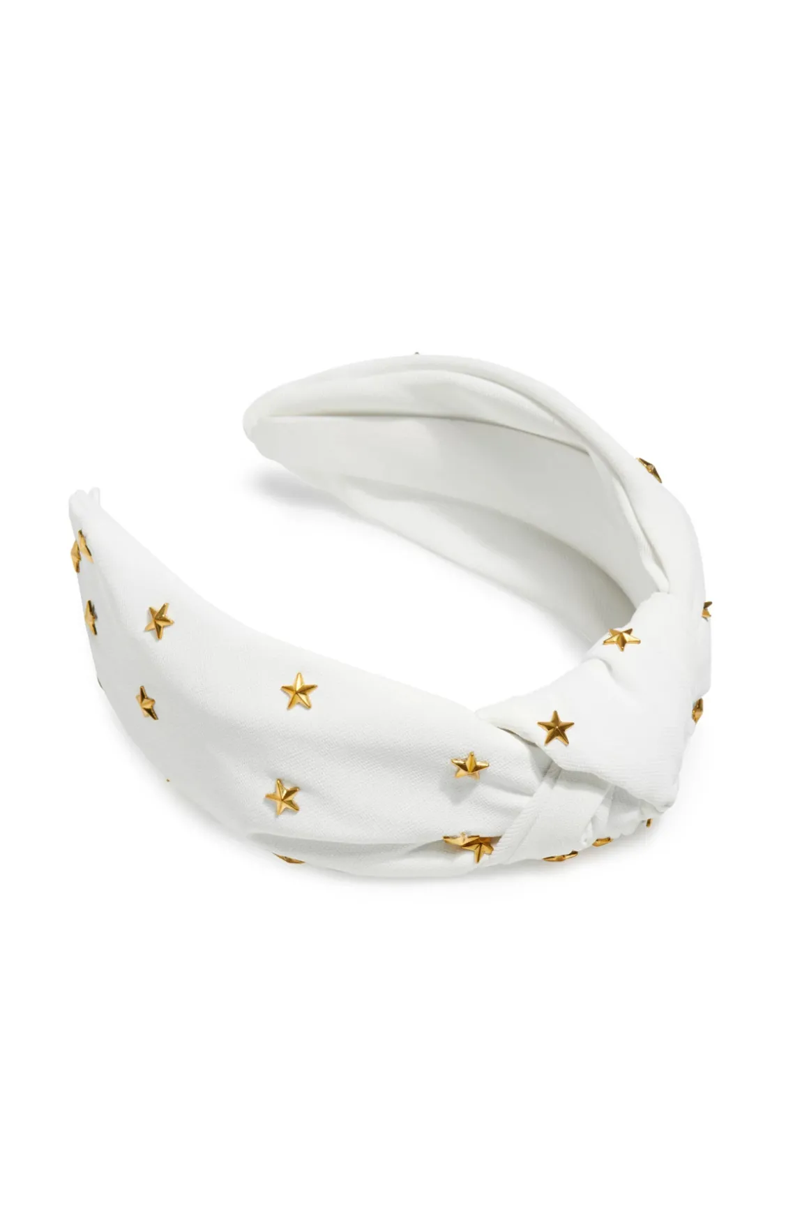 Headband features soft fabric adorned with golden star studs and a knotted detail.
