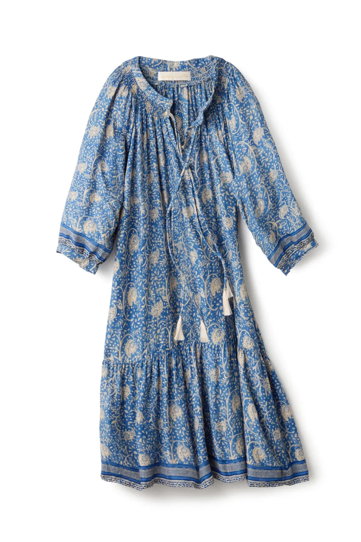 Stevie mini dress features a gathered collar, drop waist, and tassel tie at front.