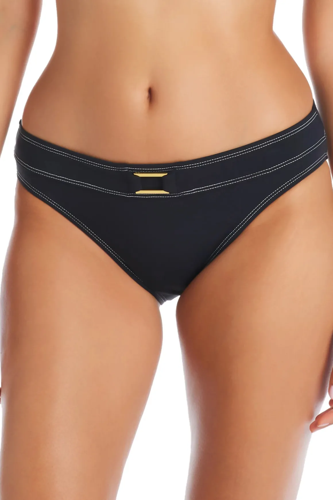 Hipster bikini bottom features unique stitching and offers moderate bottom coverage.